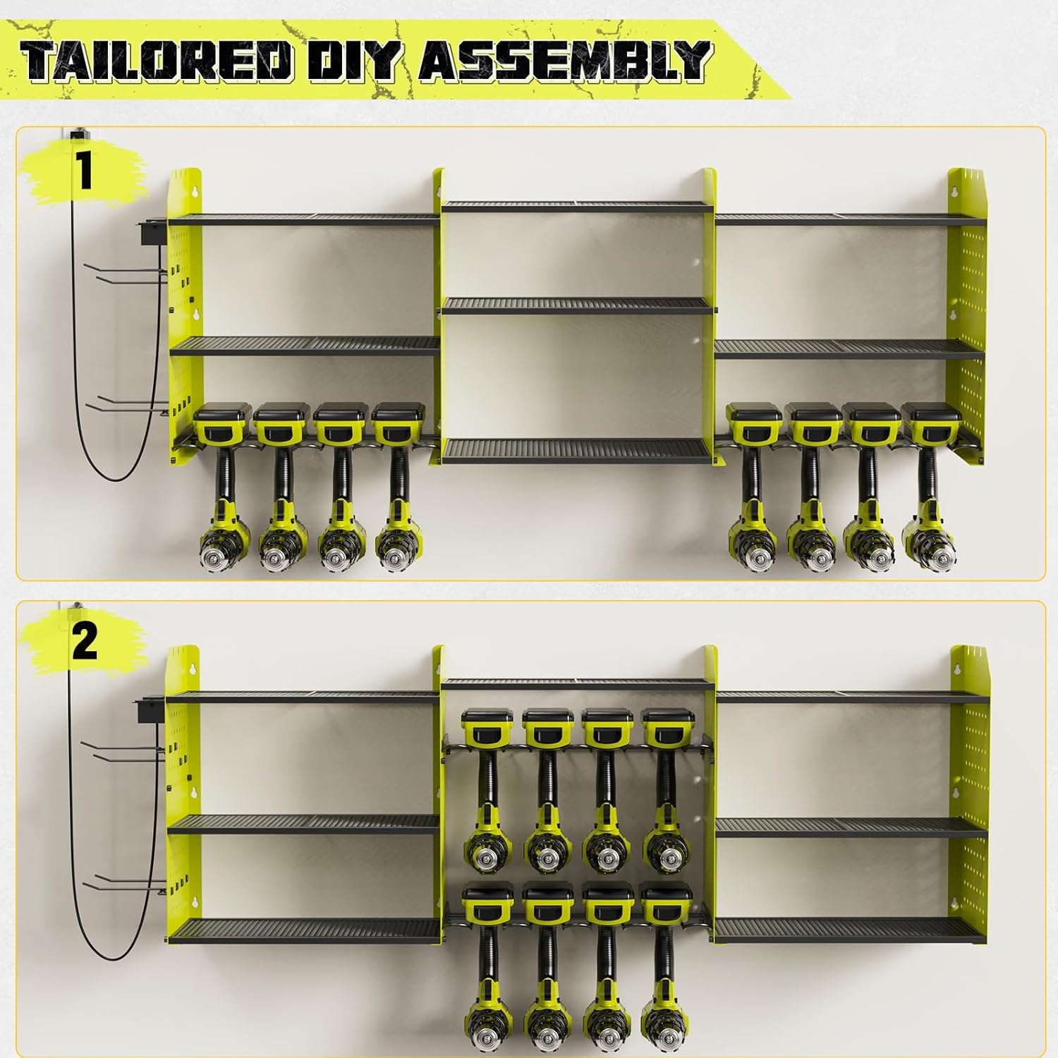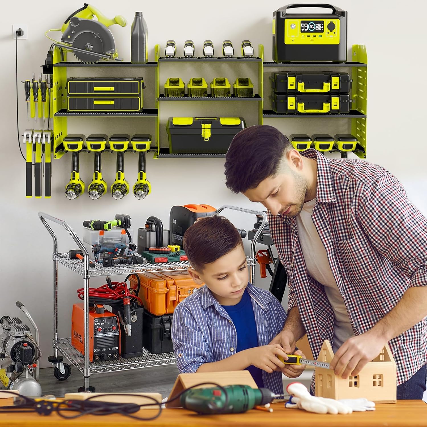 Power Tool Organizer with Charging Station Wall Mount, 3 Layer Expanded Heavy Duty Garage Organization, 45.5 Inch Length Garage Tool Storage, 8 Drills, 2 Assemble Method, Green