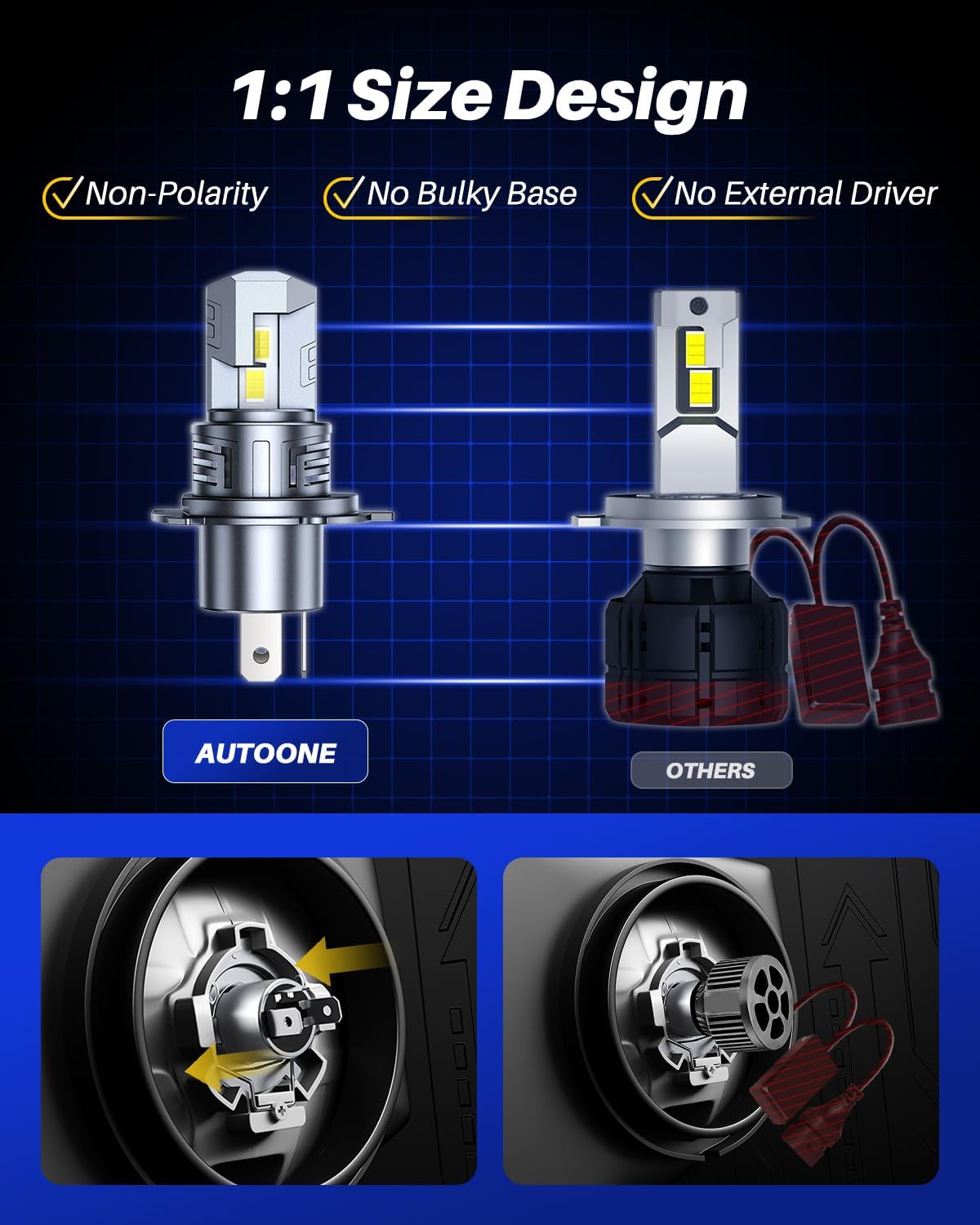 - Hassle-free Installation: AUTOONE hb2 H4 led fog bulbs feature a plug-and-play wireless and 1:1 size halogens’ design that allows people to get rid of bulky drivers and annoying wiring harnesses. No modifications on the enclosure or housing, 5 minutes easy installation