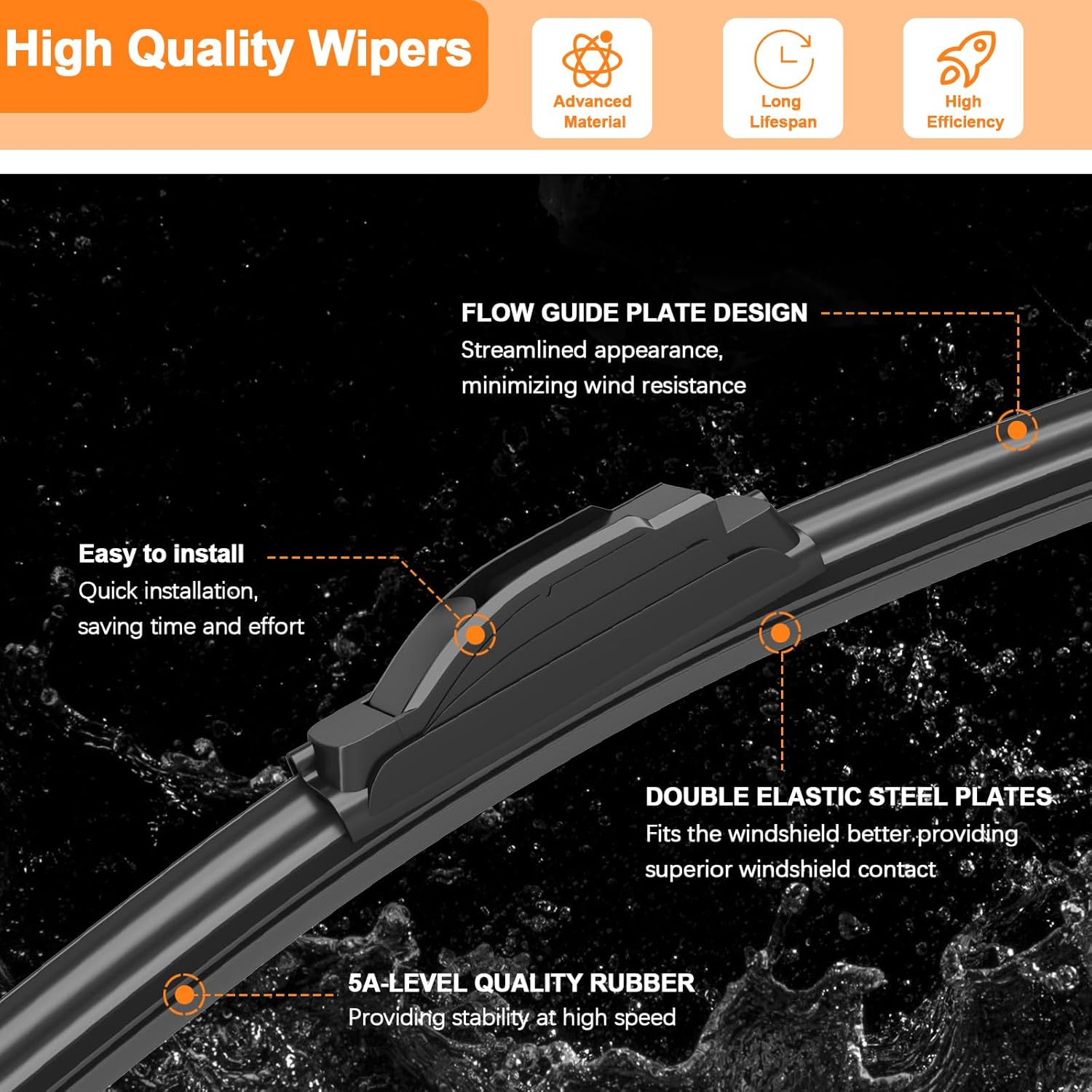 - 𝐑𝐄𝐋𝐈𝐀𝐁𝐋𝐄 𝐒𝐄𝐂𝐔𝐑𝐈𝐓𝐘: Windshield wipers have a specific beam curvature, ensuring a fit without noisy. Silicone wiper blades utilize dual precision-tuned steel springs to apply uniform pressure along the entire blade length, providing clear visibility in all weather conditions
