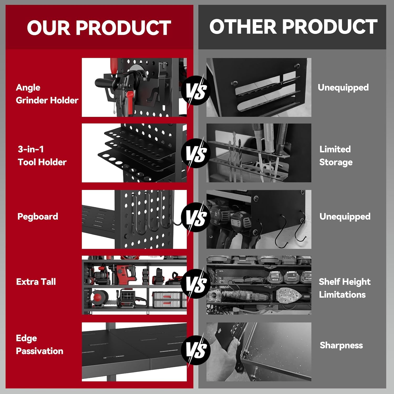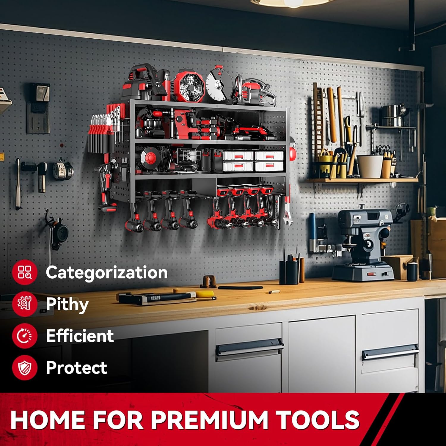 - 【 Versatile for Multiple Settings】With a simple and stylish design, our high-capacity power tool organization is compatible with various expansion accessories on the side pegboards. It is ideal for garages, garden sheds, professional workshops, backyards, and even the rear of work vans or box trucks