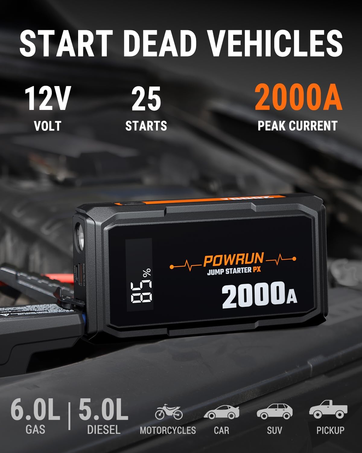 - POWERFUL BOOST FUNCTION - With 2000Amp peak current this jump starter can start the car with a dead battery in seconds, up to 20 times with a single charge. Even if the battery voltage is too low (below 9V), pressing the “BOOST” button will help the engine to restart. Powrun jump starter battery pack can start up to 6.0-liter diesel and 5.0-liter gasoline engines, which is suitable for Passenger Car, ATV, Van, Motorcycle, RV, UTV, Truck, Watercraft, Tractor.