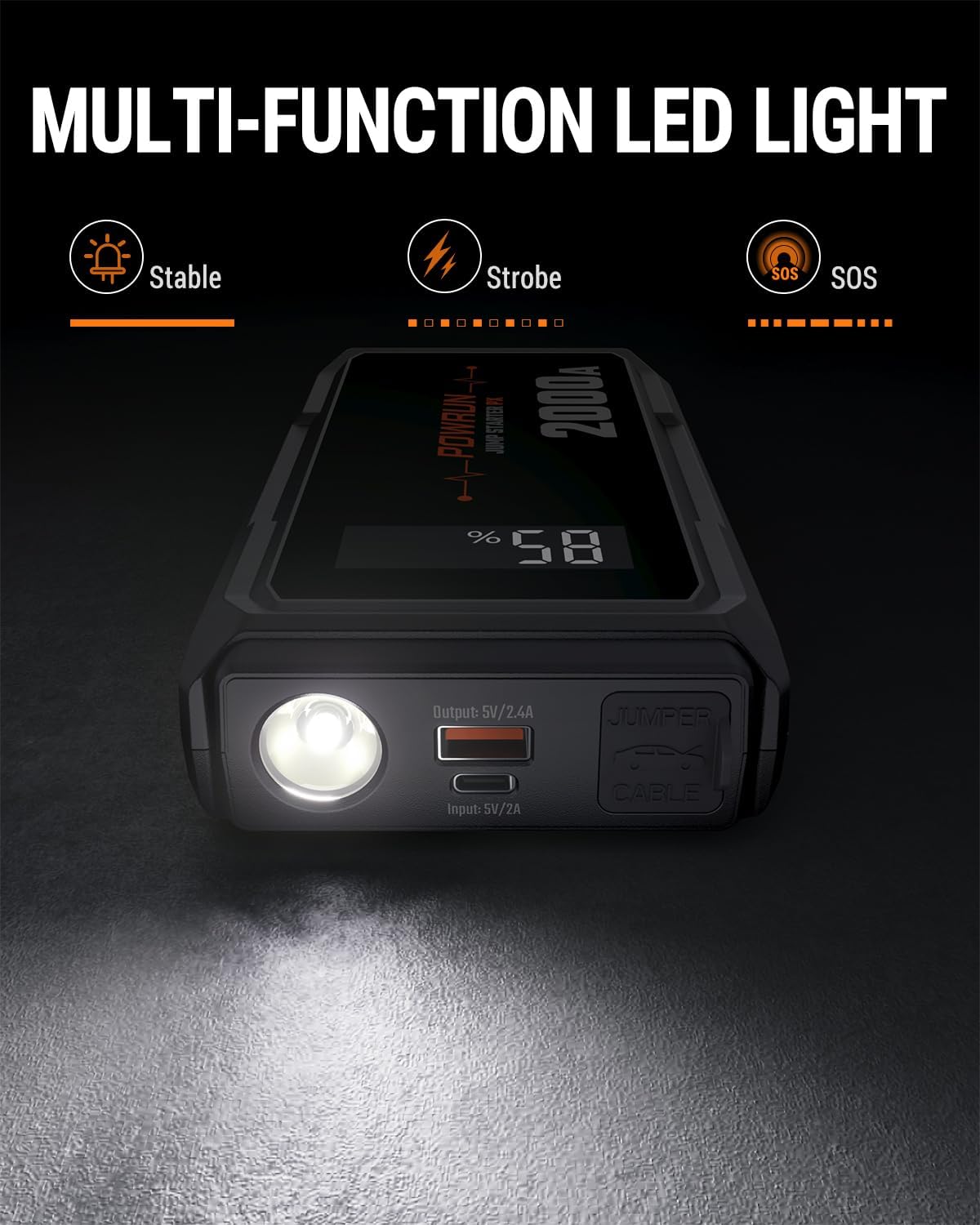 - WHAT YOU GET - Powrun P-X Jump Starter, Intelligent Jumper Cables, USB A-C Cable, Storage Bag, User Manual, Two year after-sales service. Please email us for help if you have any questions, we will answer in 12 hours.
