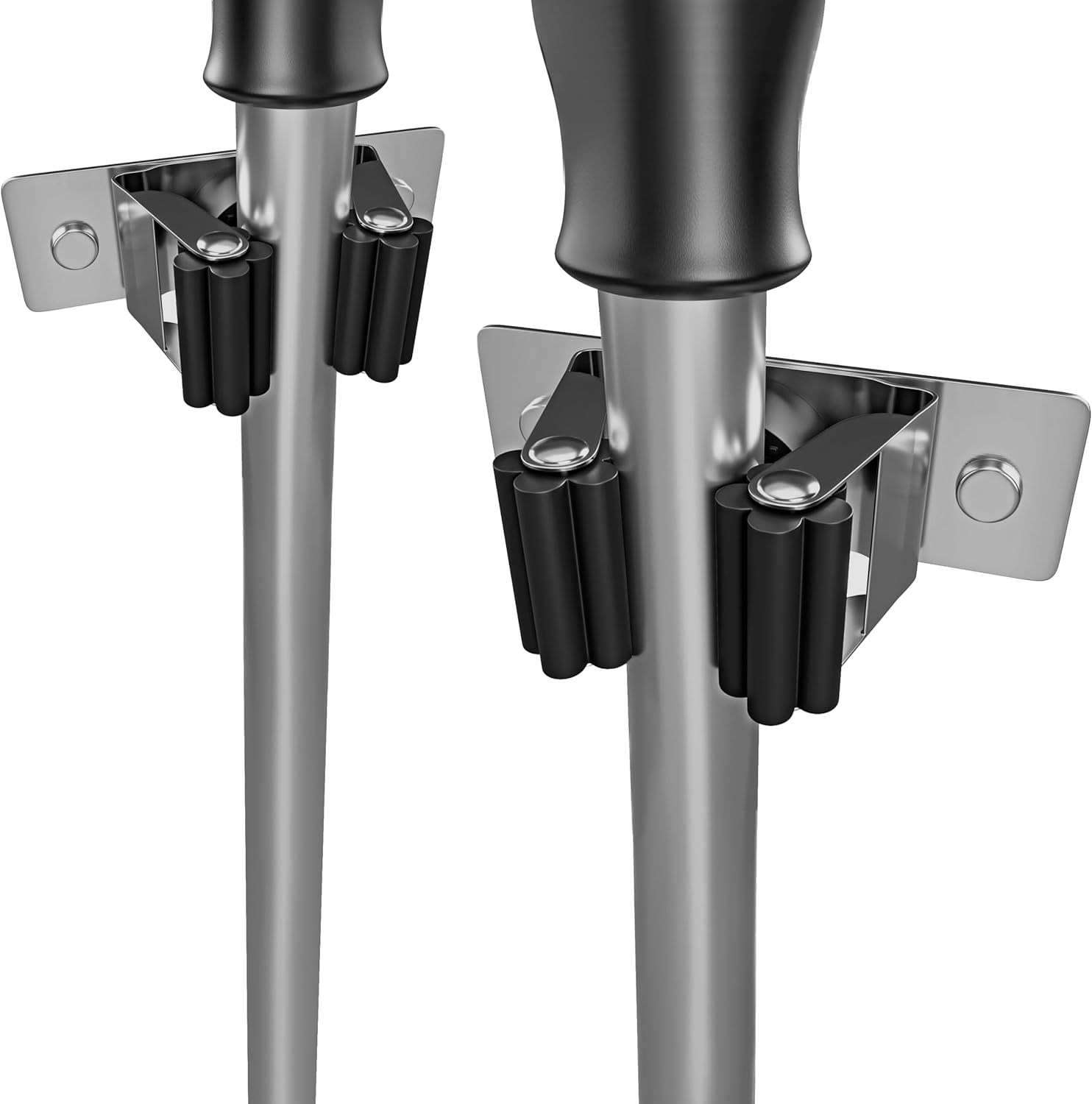 Self Adhesive Broom and Mop Holder Wall Mounted – SUS304 Stainless Steel 2-Slot Organizer with Anti-Slip Rubber Grips, 25lb Load, Adjustable for 0.6–1.4" Handles, Garage Kitchen Bathroom Use, 6 Pcs