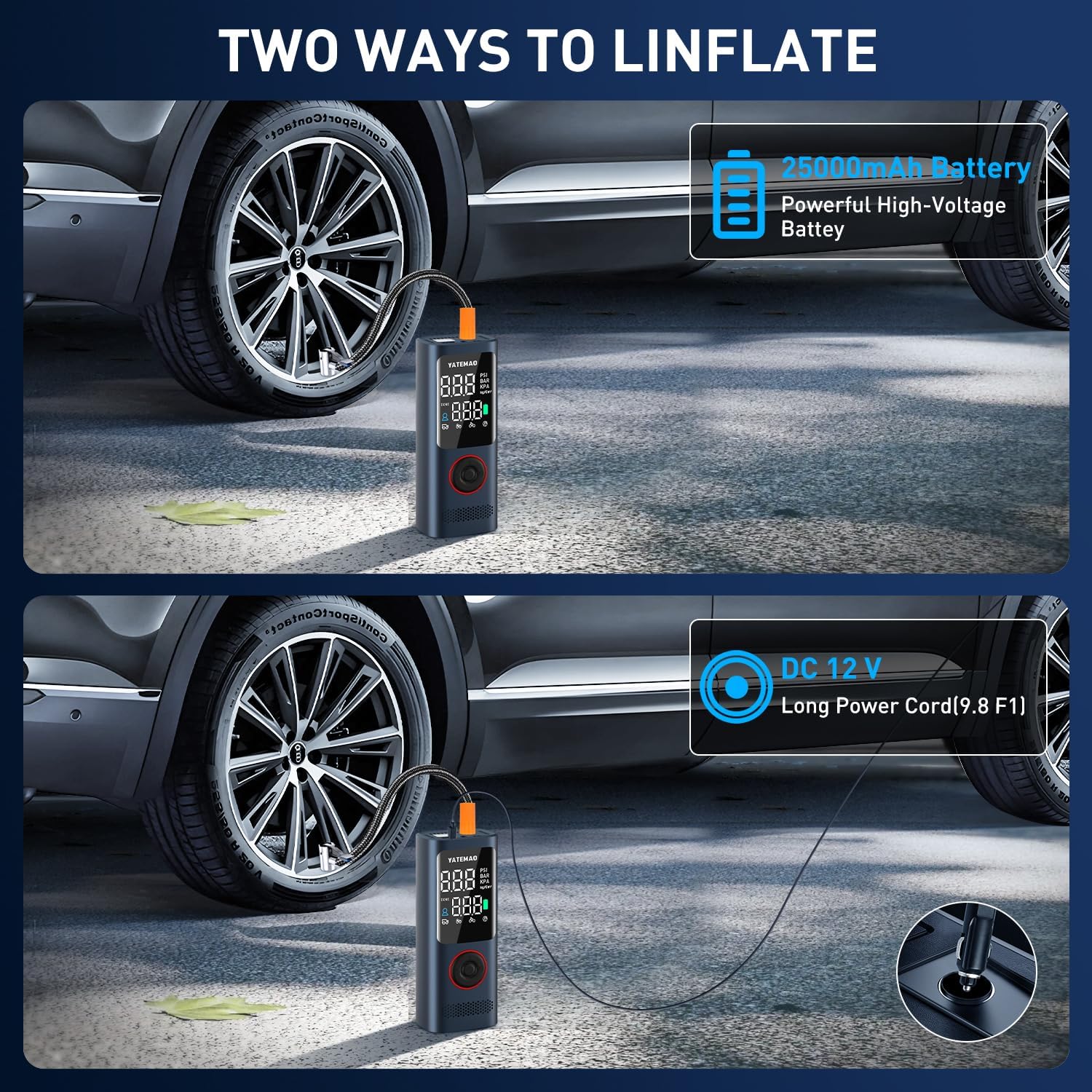- 【4X Faster & High Precision Air Compressor】This YATEMAO tire inflator is the latest design from 2024, and It is equipped with an efficient cylinder with a diameter of 25mm that boosts inflation speeds up to 36L/Min, so it takes less than 5 minutes to inflate a 195/65/R16 car tire from 0 psi to 36 psi. In addition, portable air compressor accuracy is maintained at ±1%. It's the perfect companion for the road!