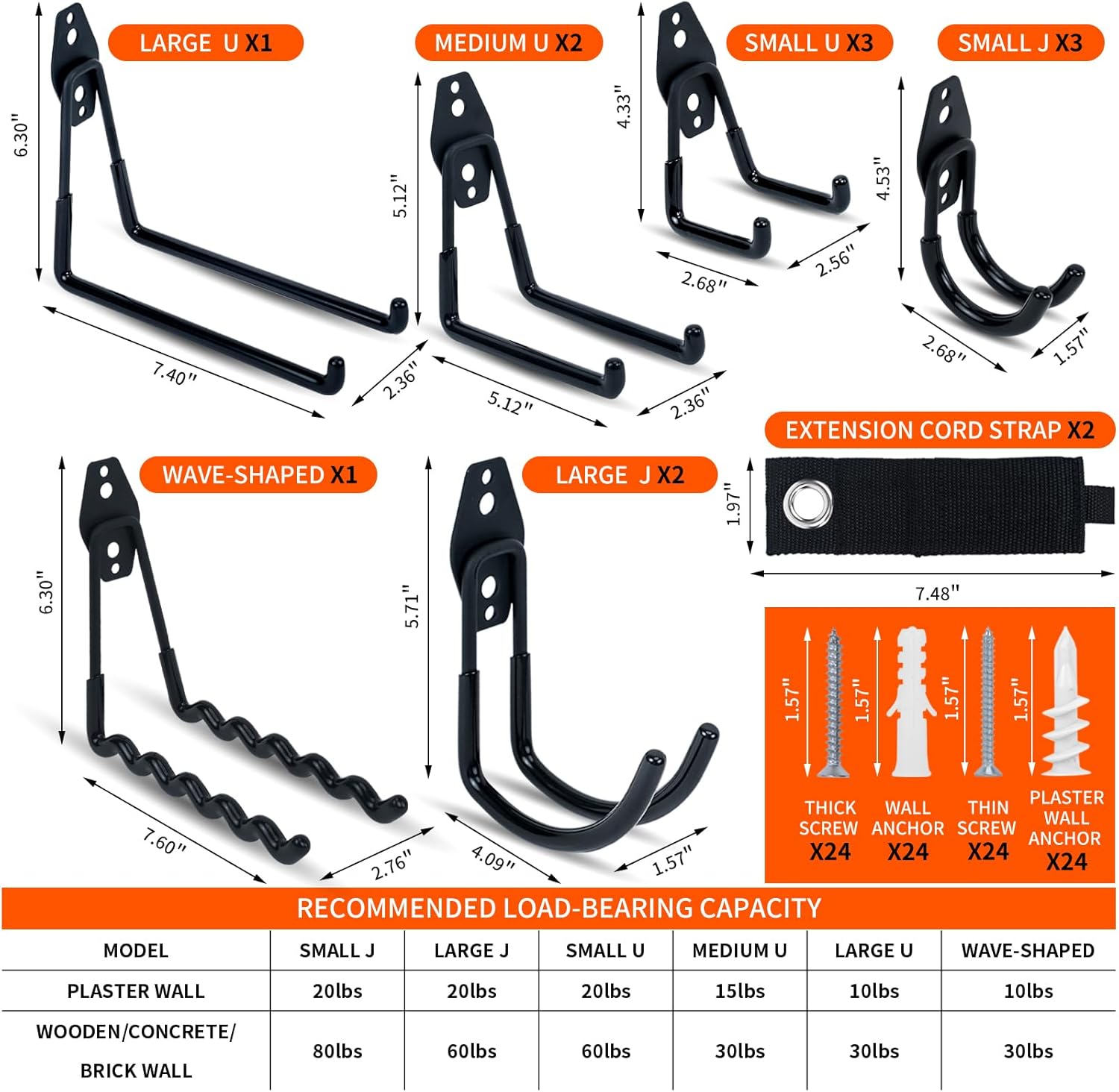 - Space Saving: This hooks kit with 2 extension cord straps is perfect for garage organization, and free up your space such as garage, garden, yard, gym, workshop, basement, barn, shed or any other space. You can hang power tools, bikes, ladders, shovels, strollers, ropes, cables and accessories to keep your space clean.