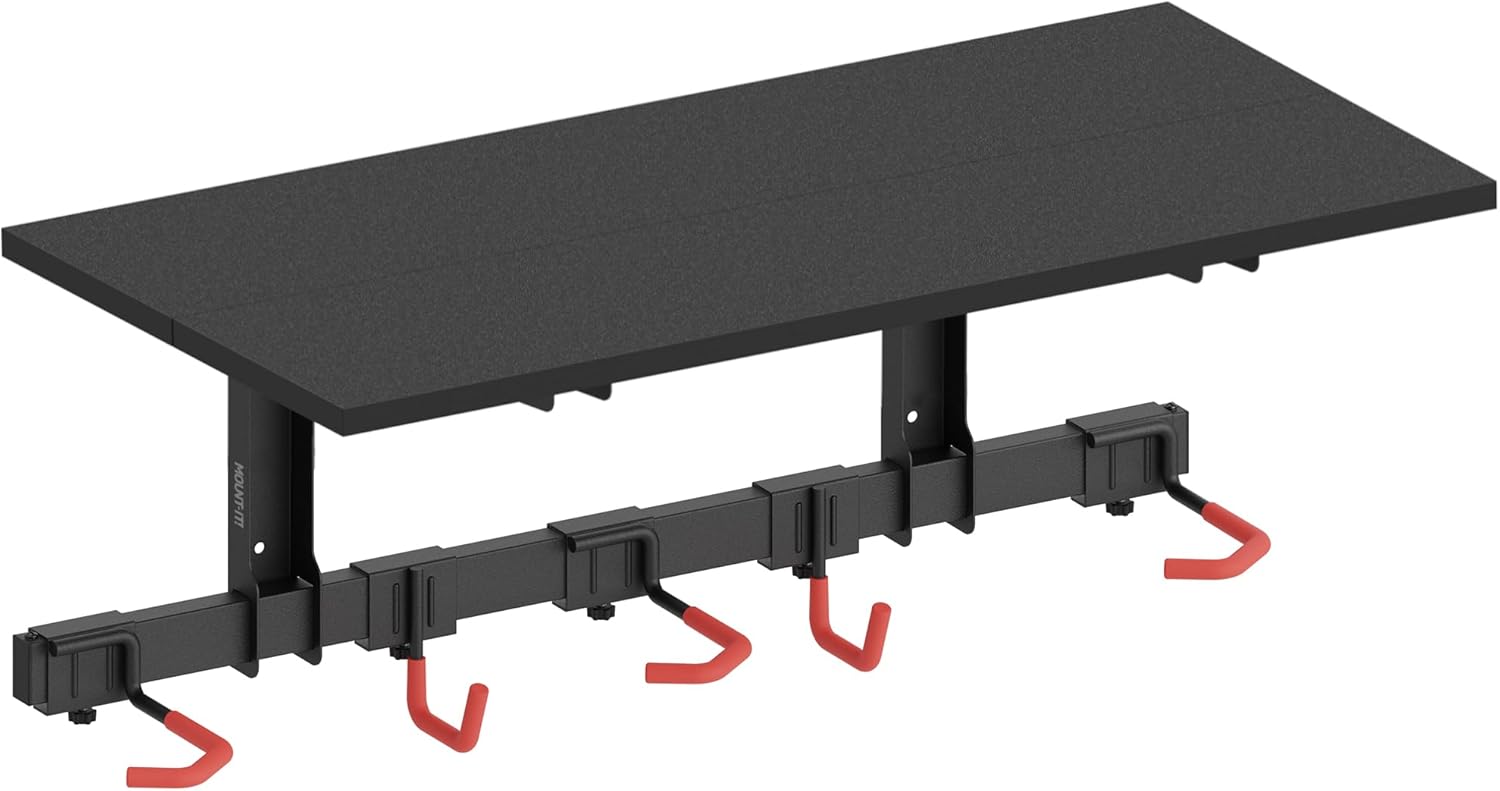 Mount-It! WheelsUp Bike Wall Mount with Shelf | Garage Storage Rack for 3 Bikes & Accessories | Adjustable Padded Hooks, 110 lb Shelf Capacity | Ideal Bike Rack Garage Wall Mount for Organized Spaces