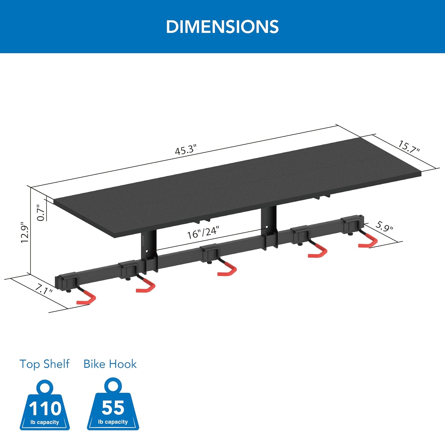 - HEAVY-DUTY GARAGE BIKE STORAGE β Built with high-quality steel and a 110 lb capacity shelf, each bike hook supports up to 55 lbs, making it ideal for securely holding all types of bikes and equipment in your garage.