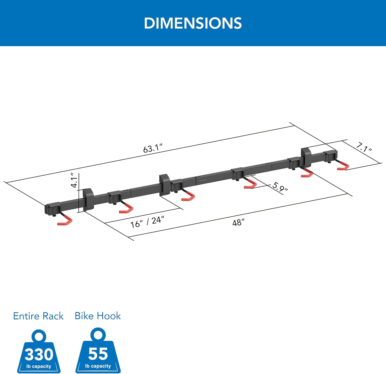 - ADJUSTABLE HOOKS FOR VERSATILE STORAGE β Customize the spacing to fit a variety of bike types. Each hook can move left or right, allowing perfect positioning for road, mountain, hybrid, and kid bikes.