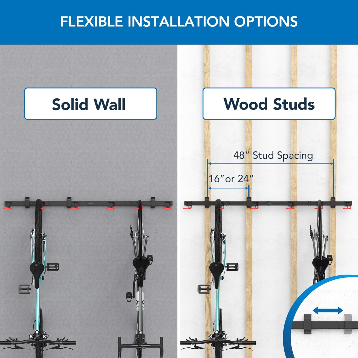 - PROTECTIVE RUBBER-COATED HOOKS β Soft-padded hooks prevent scratches and damage to your bike frames, keeping them in excellent condition while stored on the rack. EASY INSTALLATION ON SOLID WALLS β Designed for wood studs and solid walls, this wall mount bike rack includes all necessary hardware, making setup quick and simple for any garage or shed.