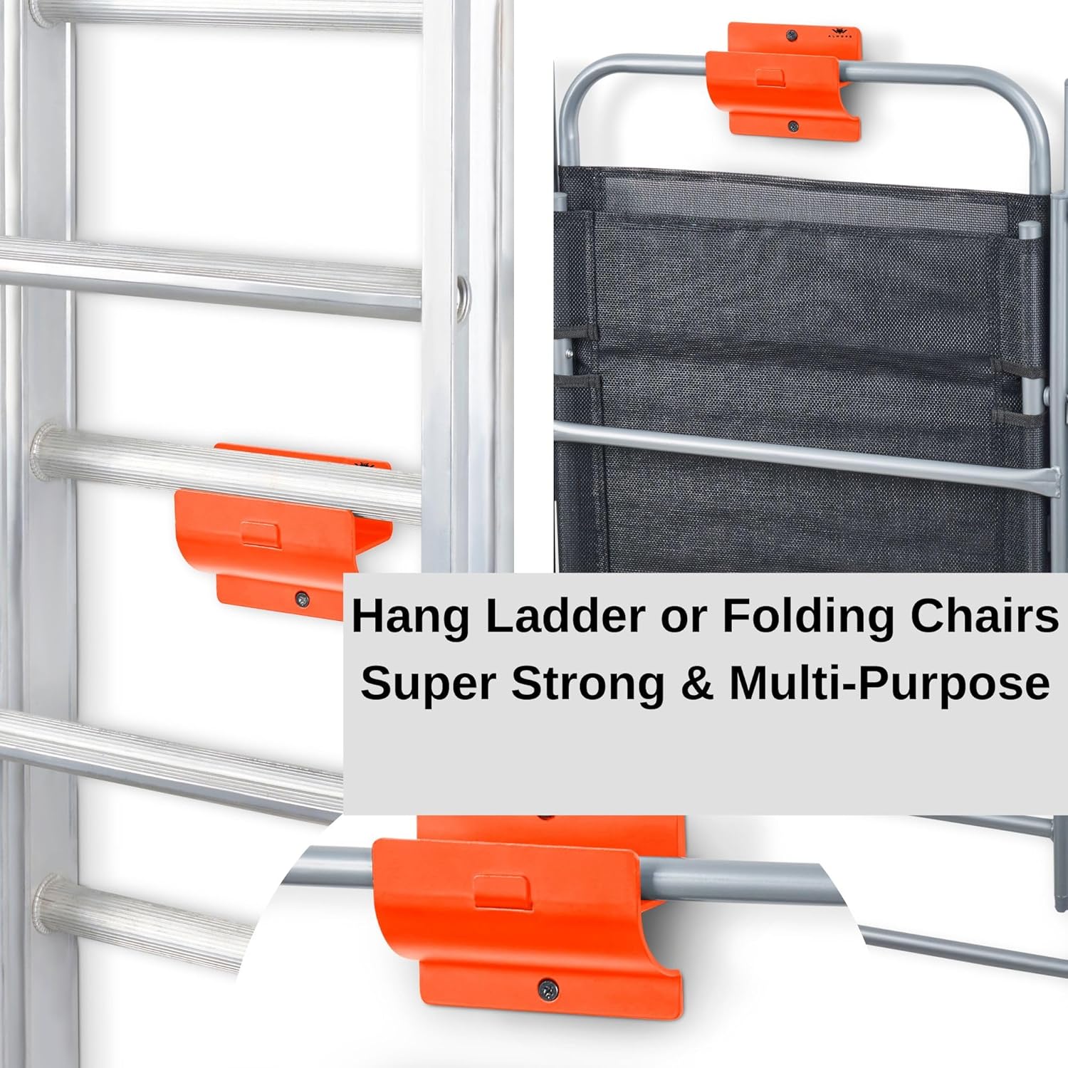 Ladder Hangers for Garage Wall Set of 2 Hooks- Orange Step Stool Hanger Wall Mount. Tool Holder for Shed, Workshop, Garden - Hang Wheelbarrow, Folding Chair
