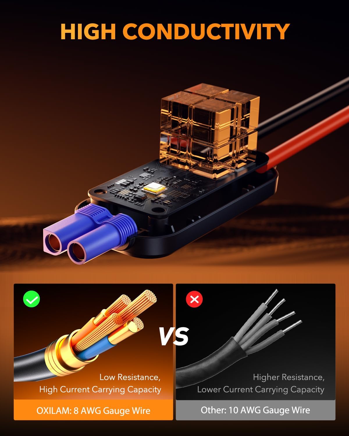 - ăEfficient 12V Car Battery Jump StarterăOXILAM jumper cables have heavy-duty clamps with better conductivity and an ergonomic grip for easy use. OXILAM use 8 AWG electrical wire which has lower resistance and a higher current carrying capacity than other brands on the market which use 10 AWG gauge wires. The extended cables help reach various battery terminals