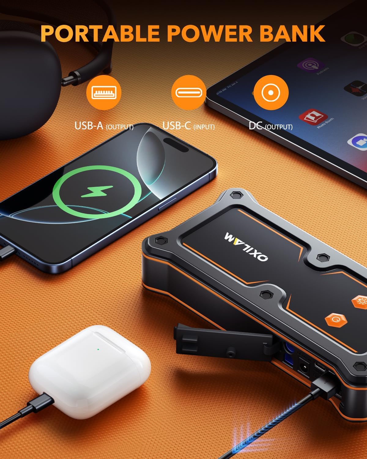 - ăWidely Compatible Portable Power BankăThis jump start battery pack can serve as a high-capacity power bank, compatible with a variety of devices. It is equipped with a 5V/3A Type-C input port, two 5V/2.4A USB-A output ports, and a 12-16.8V/10A DC output port. It can charge smartphones, tire inflators, car refrigerators, and various electronic devices on the go, meeting the charging needs of all electronic devices during travel