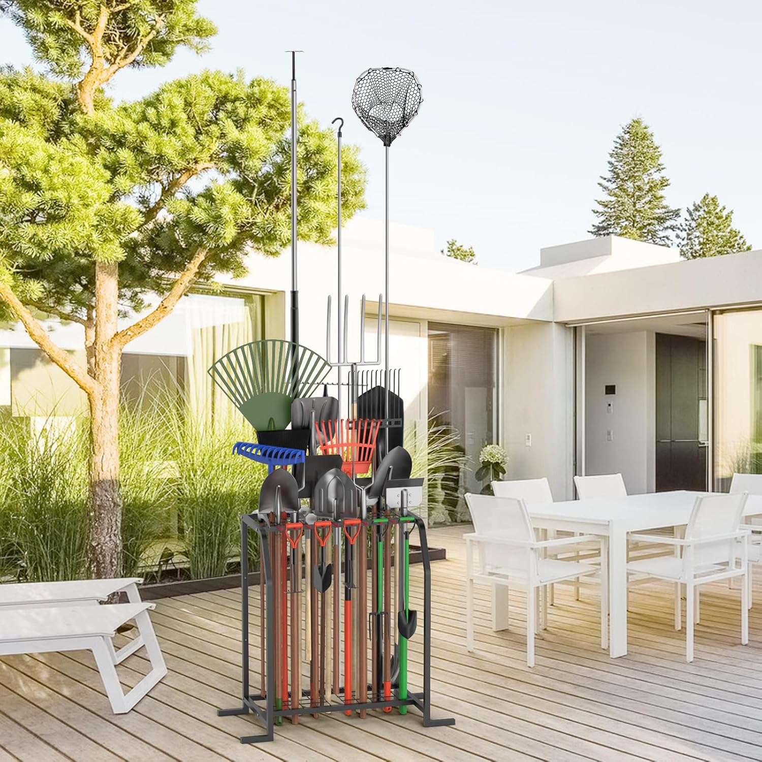 - NEVER FALL OVER - Our free-standing garden tool rack adds thickened structure and 4 thickened bases at the bottom, it will more durable than others. And assure your long-lasting, stable storage. Never Fall Over Again!