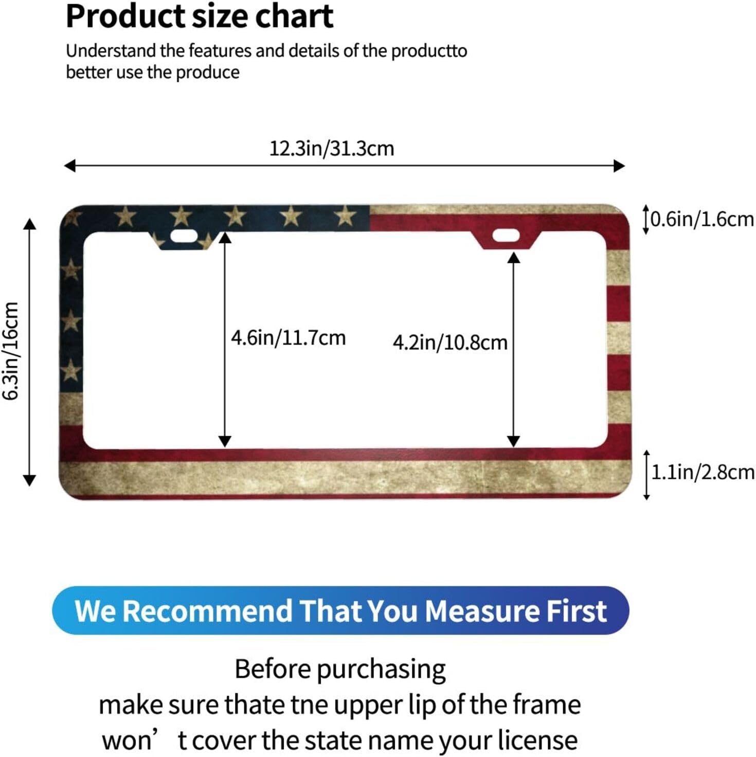 - Appropriate Size: The Size Of The American Flag License Plate Frames Are About 12.3 X 6.4 Inch, Please Confirm If Your american eagle license plate holder Size Will not Cover Your County Sticker or Relatively Important Informtion Before Placing The Order of the patriotic license plate frame