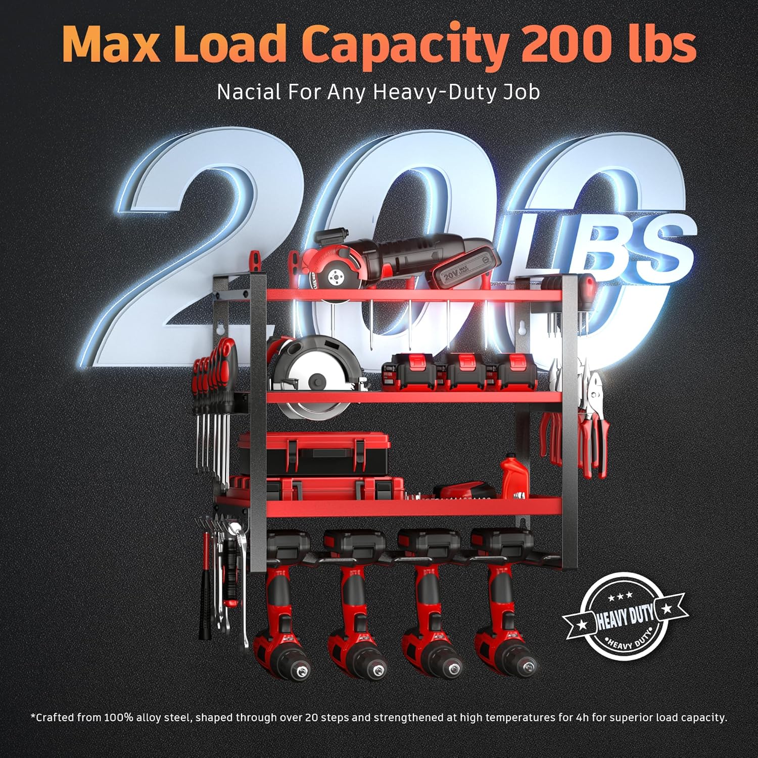 - Max Load Capacity 200 Lbs: Nacial power tool organizer wall mount crafted from 100% premium heavy-duty solid steel, shaped through over 20 precision steps and strengthened at high temperatures for 4 hours for 200 lbs superior load capacity. Can secure mounting on concrete, drywall, or pegboard, ensuring exceptional stability. With our tools organizer wall mount, your tools will always stay securely in place, ready for any task
