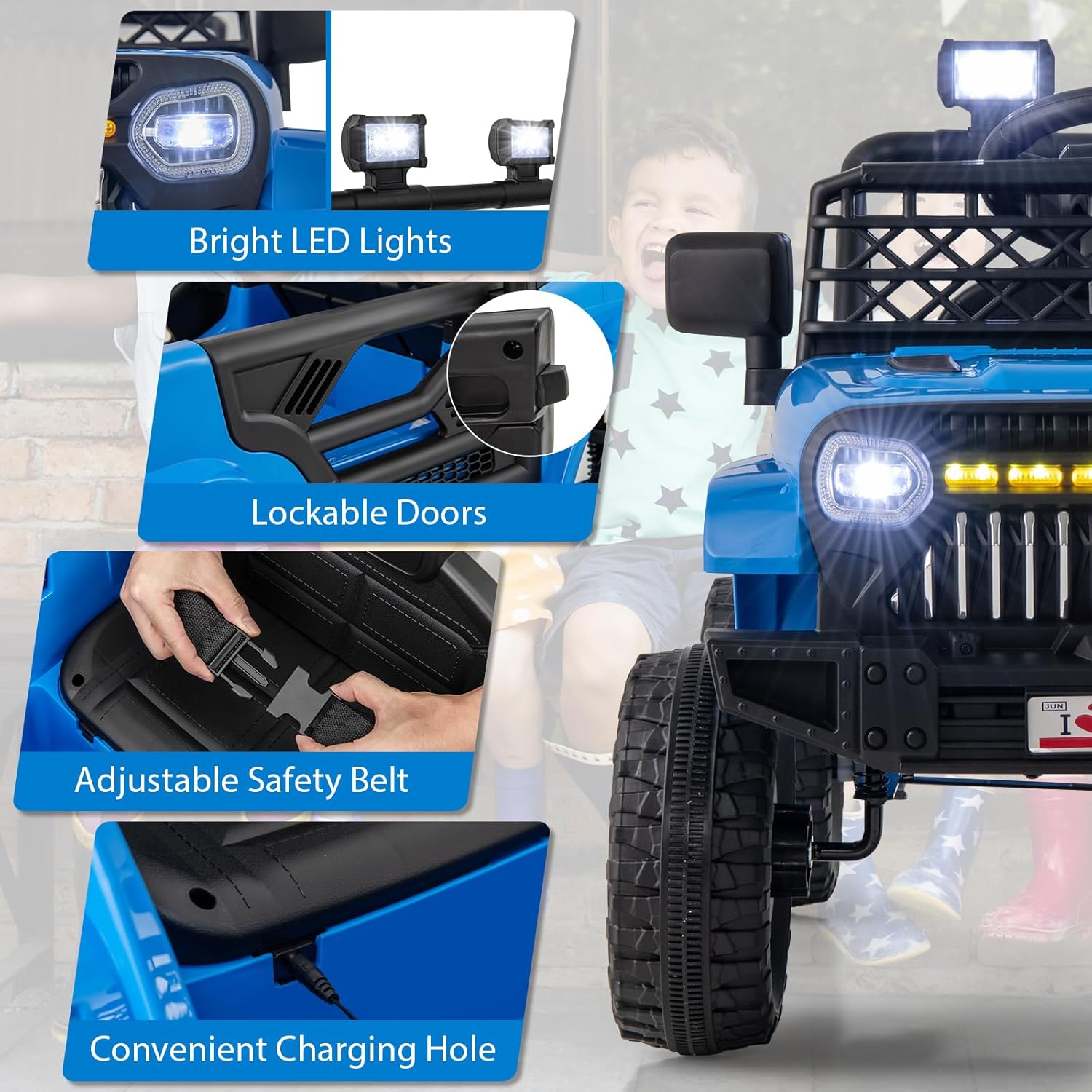 - 【Secure & Smooth Ride】 Equipped with an adjustable safety belt and lockable doors, the 12V ride on truck ensures your child’s safety. The soft start function prevents sudden accelerations scaring kids. With shock-absorbent tires, the car brings a comfortable riding experience on different surfaces, such as the asphalt road, cement road, and brick road.