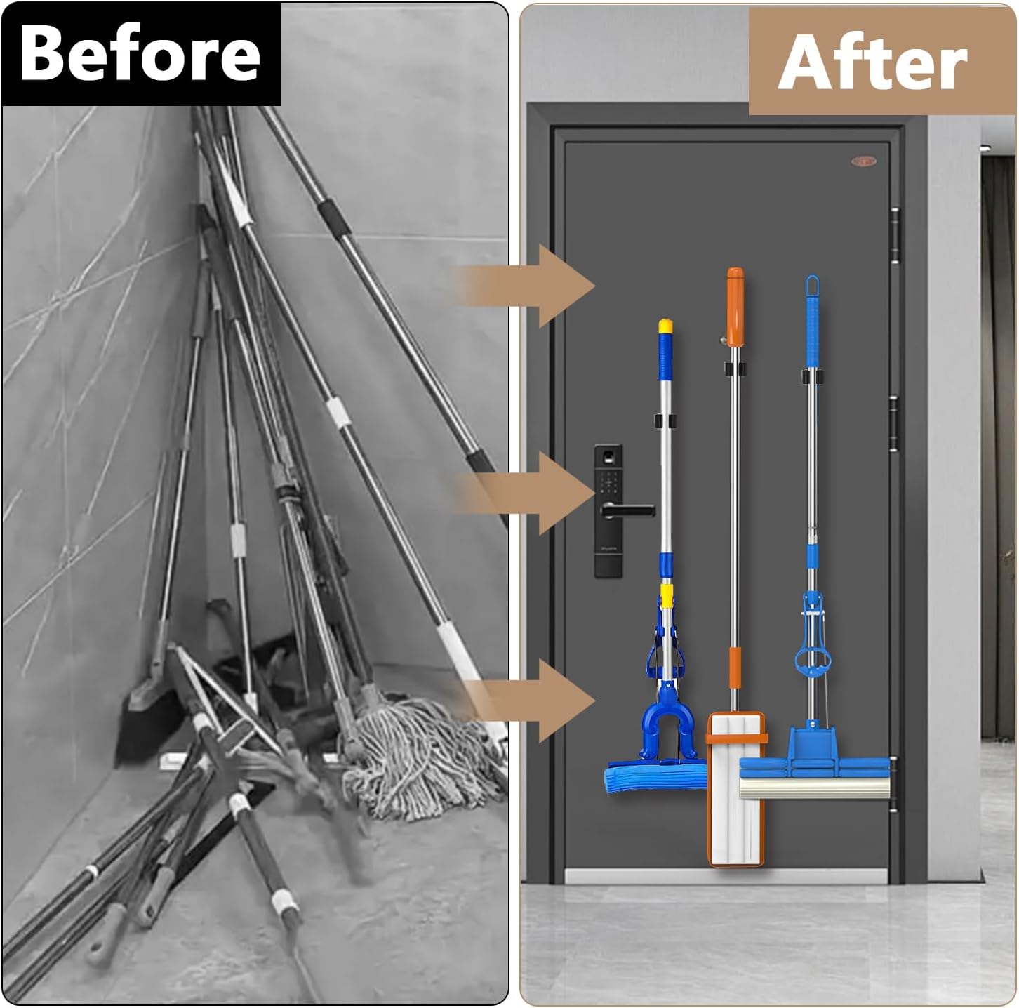 - [INDOORS OR OUTDOORS ] Using mop and broom holder wall mount tidy up your broom, mop, rakes, tools and more! Perfect for the kitchen, closet, garage, office, great for commercial use, and thanks to the waterproof design, this magnet broom even works outdoors or on the shed for your garden tools when you are using the screws