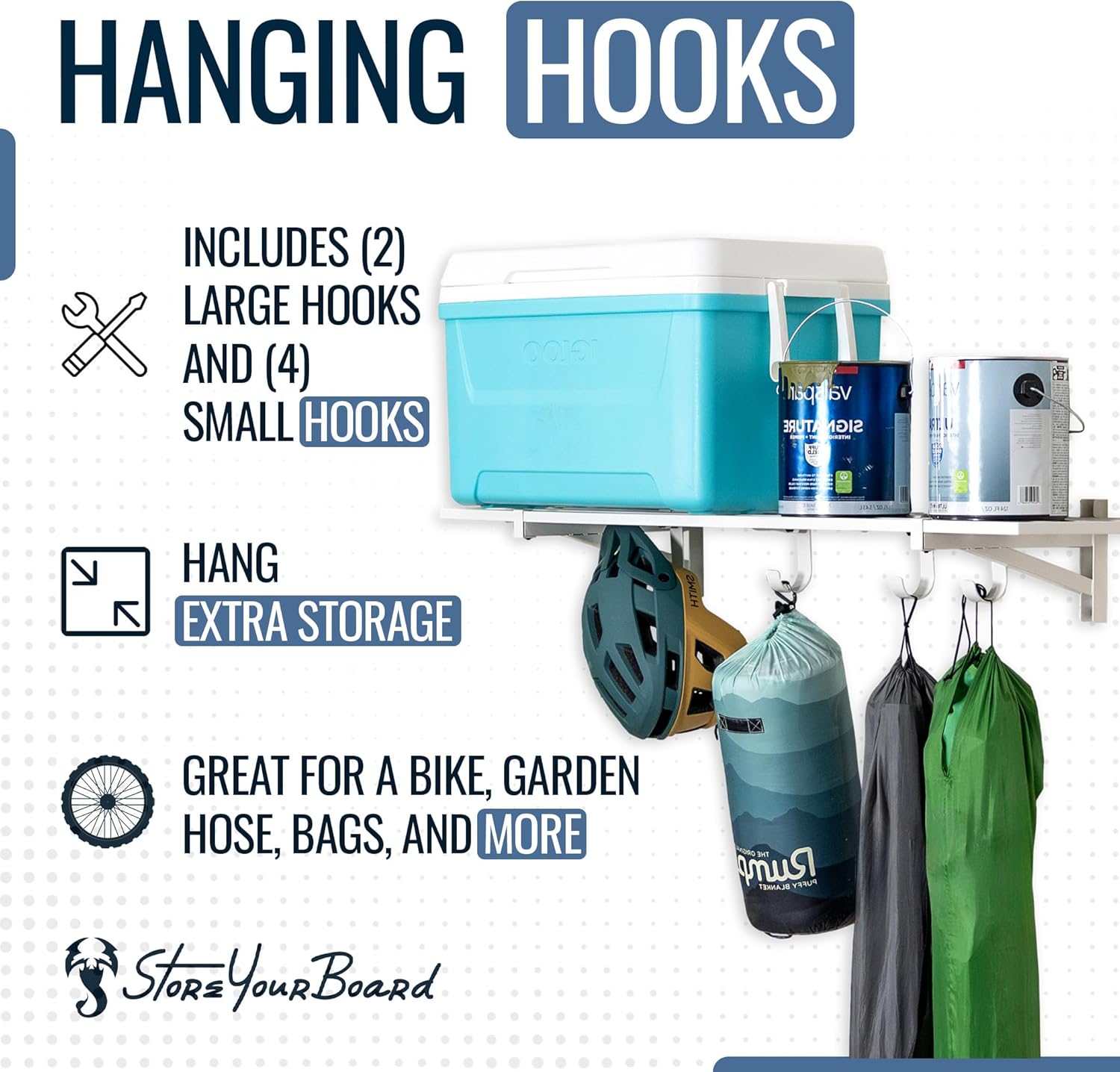 - INCLUDES STORAGE HOOKS – Comes with 2 large and 4 small garage hooks for added hanging storage under each wire shelf. Use the hooks for cords, garden tools, bags, or garage wall organizer systems. Maximize vertical space while keeping frequently used tools within reach.