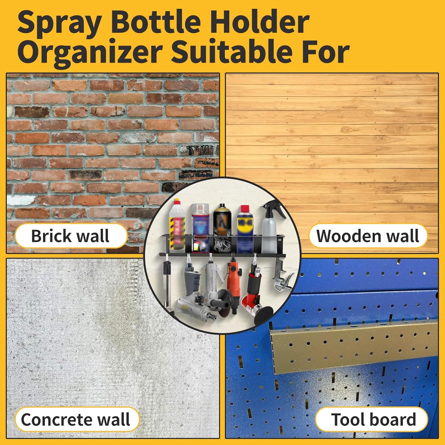 - Easy to Install: This garage spray bottle storage rack easy to install, just fix it to the wall through the mounting screws included in the package, there are 4 mounting holes for free assembly, and it can easily adapt to brick walls, wooden walls, cement walls, and plaster walls