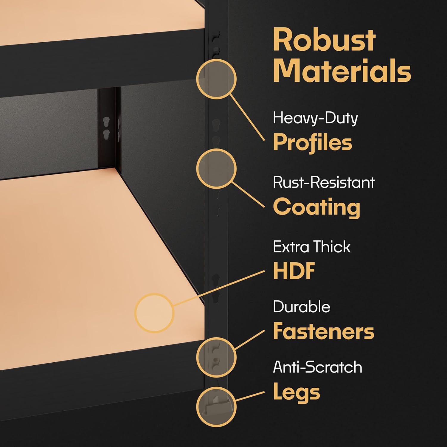 - PROPERLY STRONG AND DURABLE. Rely on this shelving to unfailingly hold your heavy possessions. All these metal shelves have extended profiles and rust-resistant coating. The heavy duty shelves themselves are extra thick HDF and come with robust bolts and rivets.