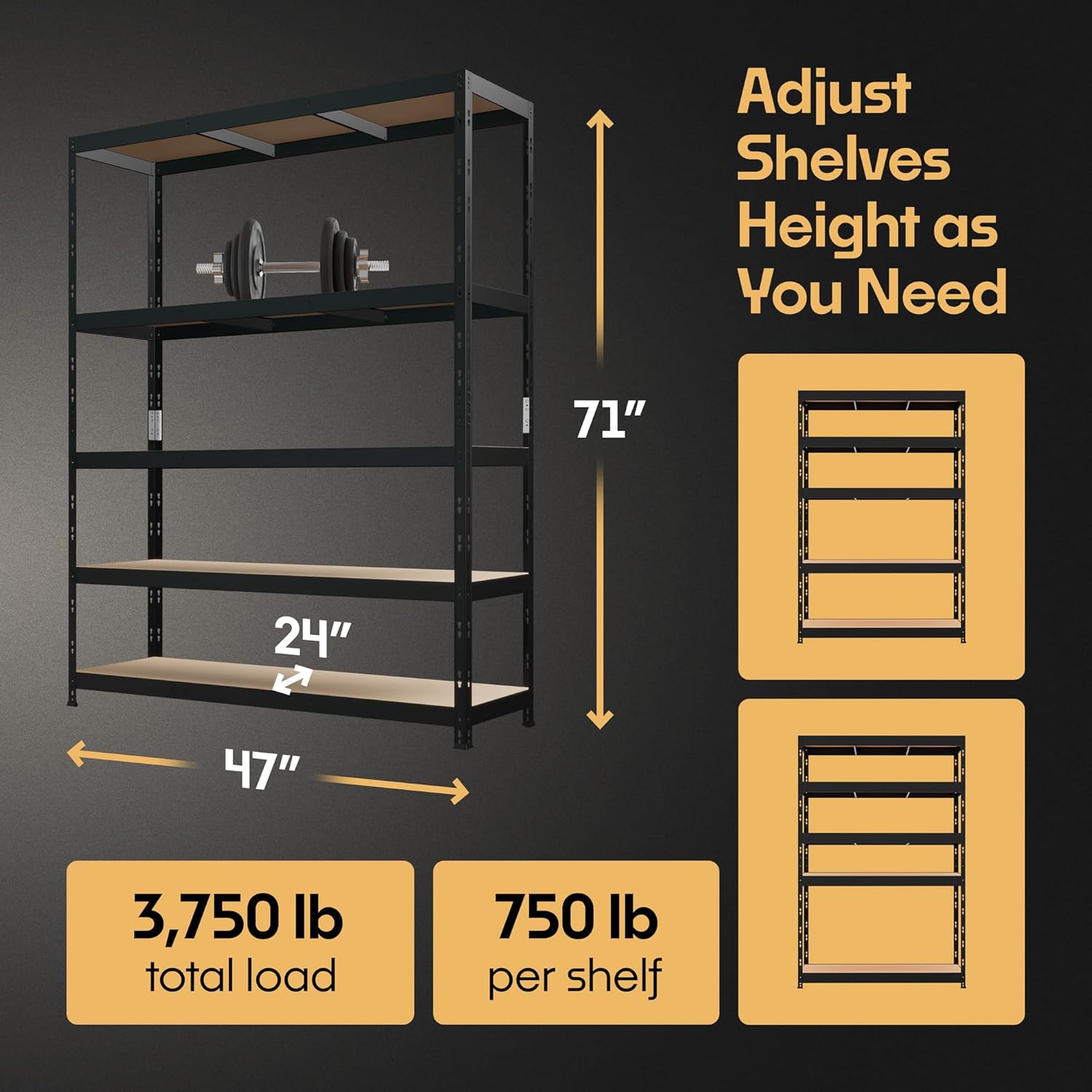 Storage Shelves: 5 Storage Shelves Heavy Duty w/ 3,750 lb Total Load Capacity, 750 per Storage Shelf, 71x47x24 | Perfect Solution for Your Storage Needs, Adjustable Shelving Unit