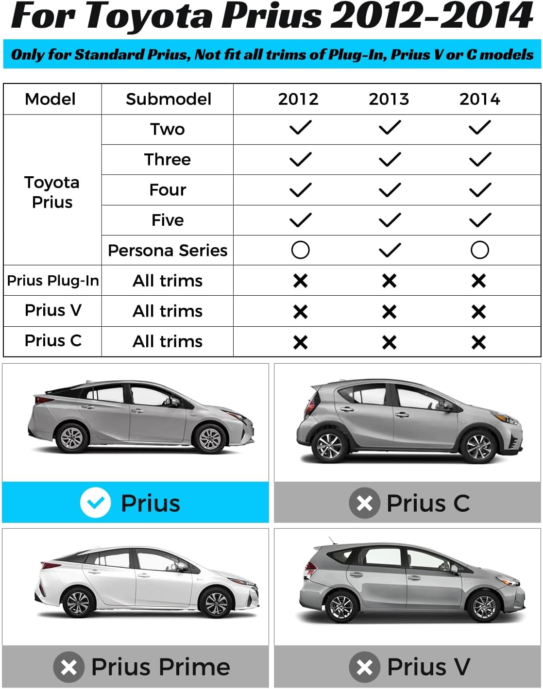 - Custom Fit Floor Mat: COTAZA car floor mats for Toyota Prius 2012-2014(Not Fit Plug-in, V or C Models) are crafted using precise laser scanning tech, ensuring a glove-like integration with every curve and contour of your car's floor. Just left the grocery store, milk spilled or gardening supplies leaked? Our car mats full set for Toyota Prius 2012-2014 block all accidental spills and wear, keeping your trunk pristine