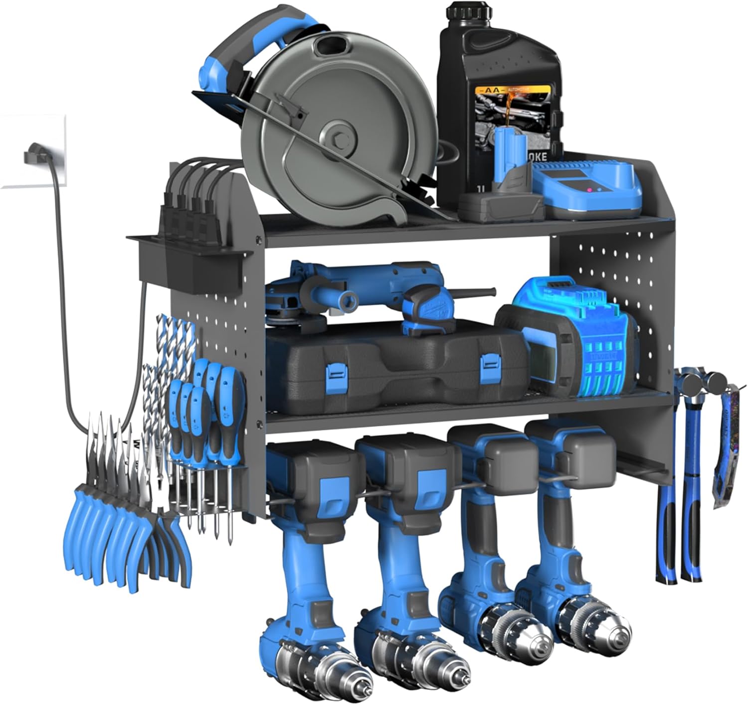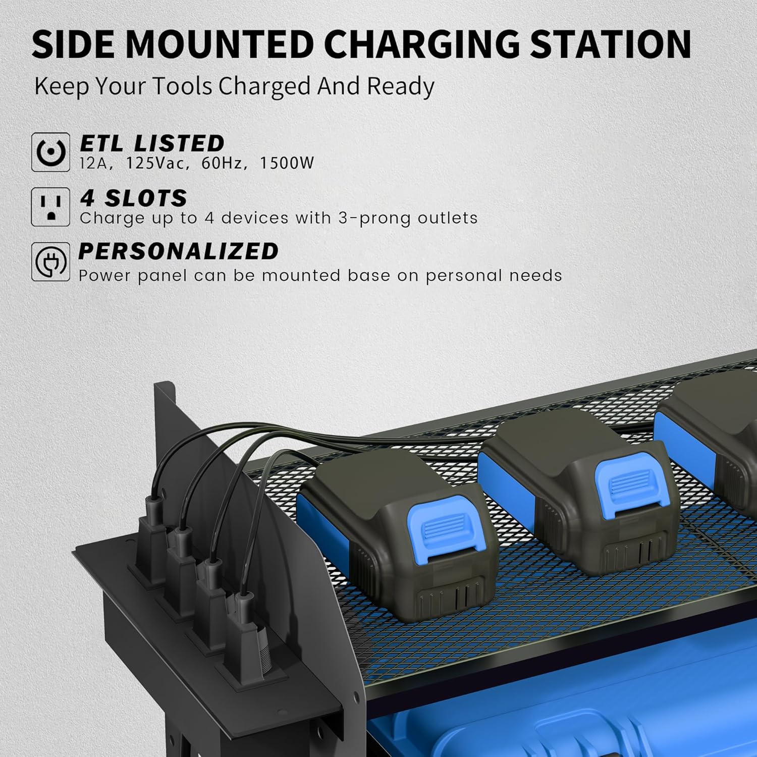 - Side Mounted 4-Outlet Charging Station:This wall-mounted power tool organizer charge up to four batteries at once without hunting for outlets. The built-in power strip works perfectly for cordless drills, impact drivers, and other battery-powered tools, keeping your workflow smooth and cords tangle-free