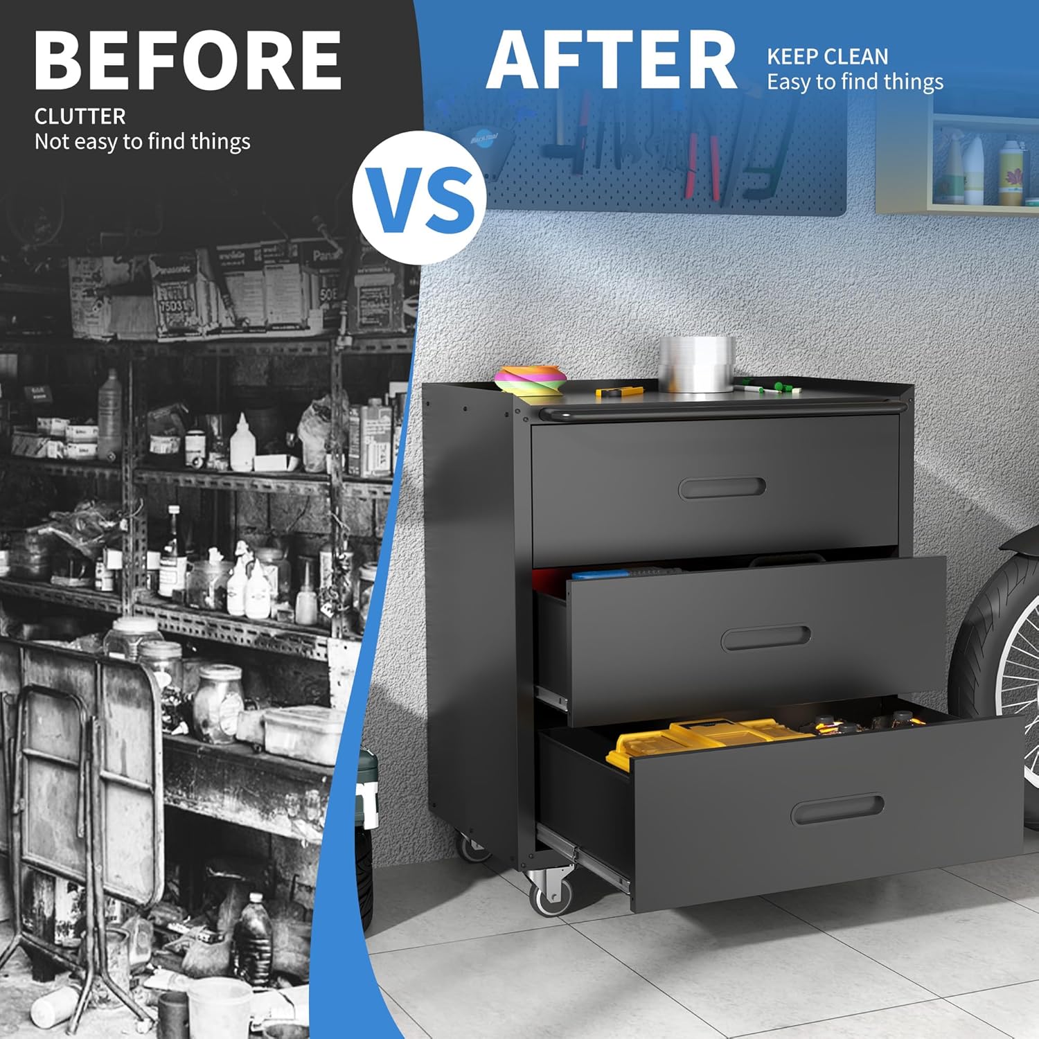 - MULTIPLE STORAGE OPTIONS: The cabinet measures 16.54"D x 29.53"W x 34.66"H. The cabinet comes with 3 large capacity and load bearing drawers, while the top of the cabinet can also be used as a workbench. It is great for storing tools in the garage.