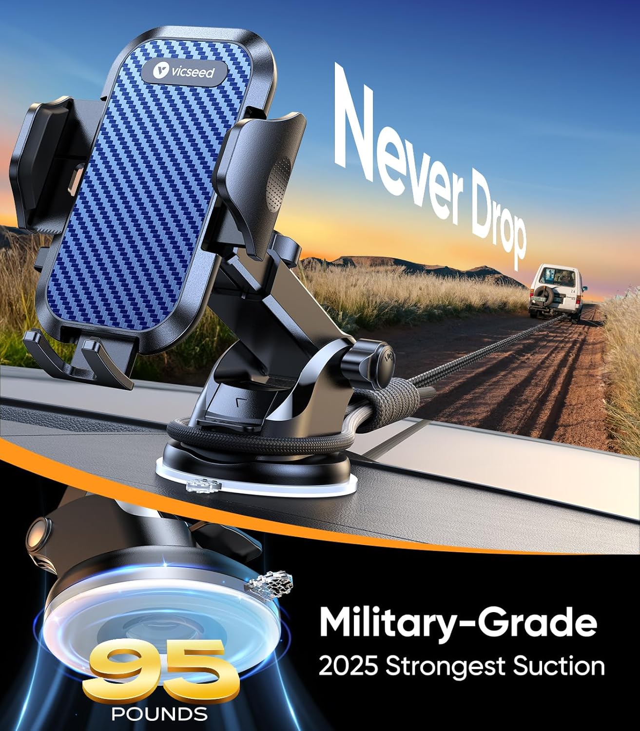 - [One-Second Release – Drive with Ease] Mount or remove your phone in one second with the quick-release button. The high-quality carbon fiber panel stays clean, scratch-free, and fingerprint-resistant. Trusted by 9.5M+ drivers, VICSEED delivers the most durable and reliable car phone holder mount.