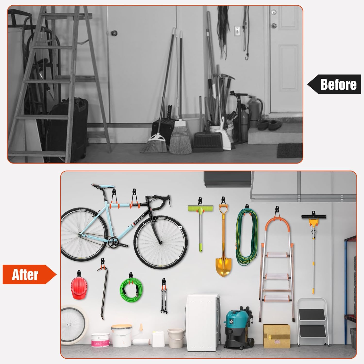 - TOOL ORGANIZER:A set of garage hooks consists of 12 heavy duty garage hooks in 4 sizes for a variety of scenarios. Whether it's gardening tools such as shovels and mops or garage items such as bikes, they can be easily organised
