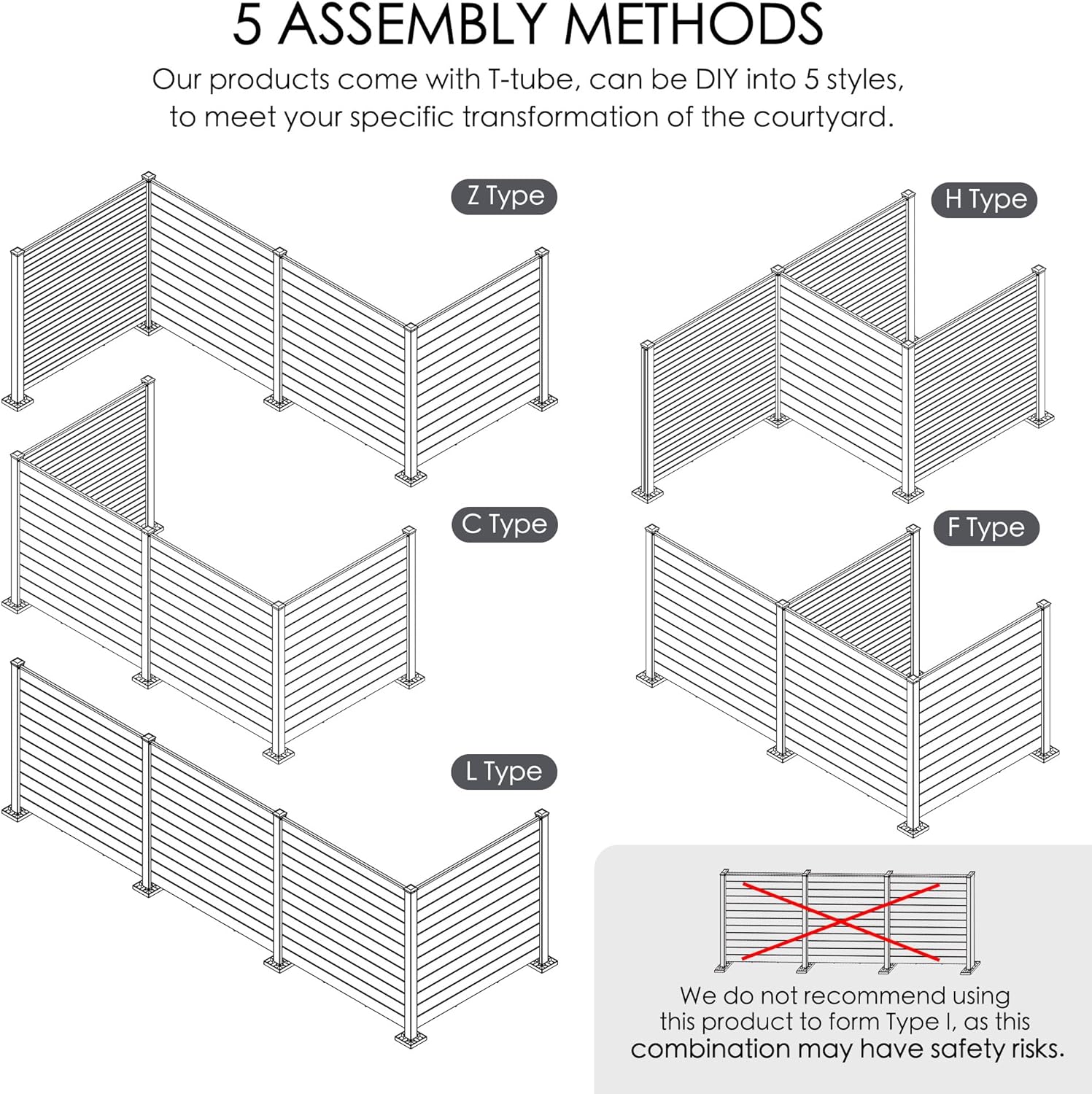 - Easy to Install: The outdoor privacy fence panel screen comes with all the necessary hardware for easy assembly. And we add a new assembly parts-Three-slot Post T, configurable into straight,''Z'', "F", "L", "H"shapes, you can choose different installation methods to suit your outdoor space according to your needs.