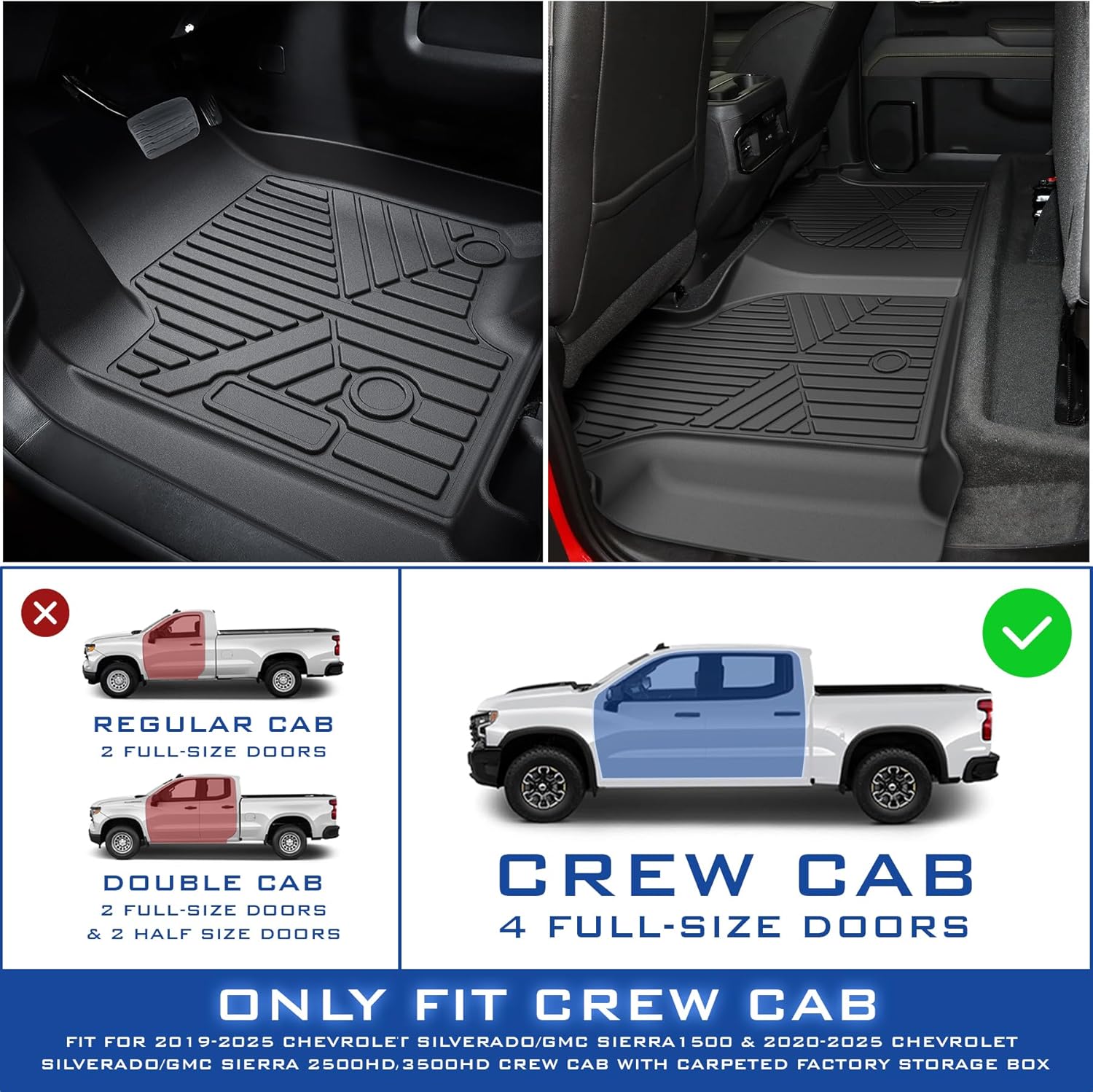 - Material Thermoplastic Elastomer (TPE) : Vehicle Service Type Fits for 2019-2025 Chevrolet Silverado 1500/GMC Sierra 1500 & 2020-2025 Chevrolet Silverado/GMC Sierra 2500HD/3500HD Crew Cab Fits for 2019-2025 Chevrolet Silverado 1500/GMC Sierra 1500 & 2020-2025 Chevrolet Silverado/GMC Sierra 2500⌠See more
