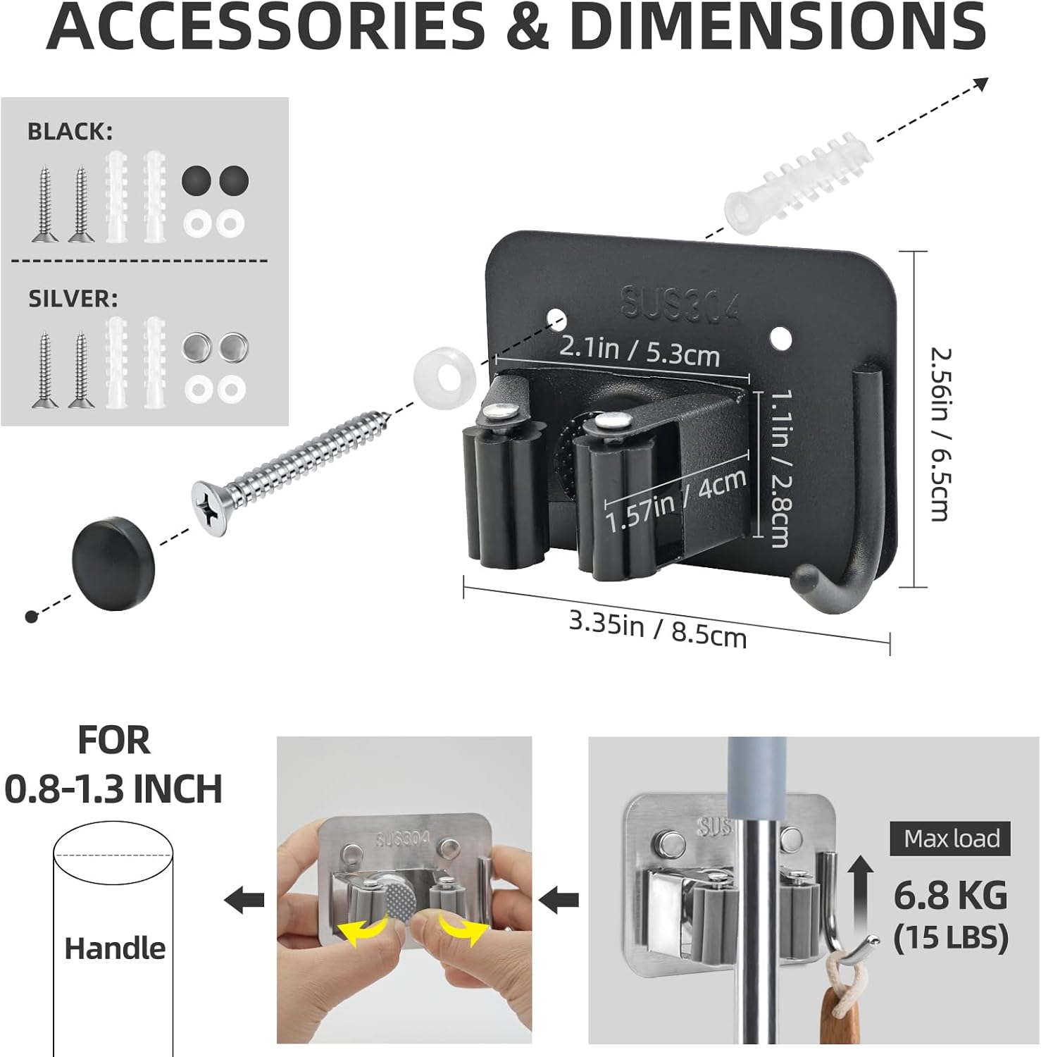 - 🧹【Utility & Aesthetic】Crafted from premium 304 stainless steel, this broom rack is durable and also rust-resistant. Our wall-mounted broom hooks can support an impressive weight of up to 15 pounds. In addition, each bracket is equipped with two screw decorative caps of the same color to ensure aesthetics. The sleek silver brushed and black frosted process designed to blend seamlessly into your space.