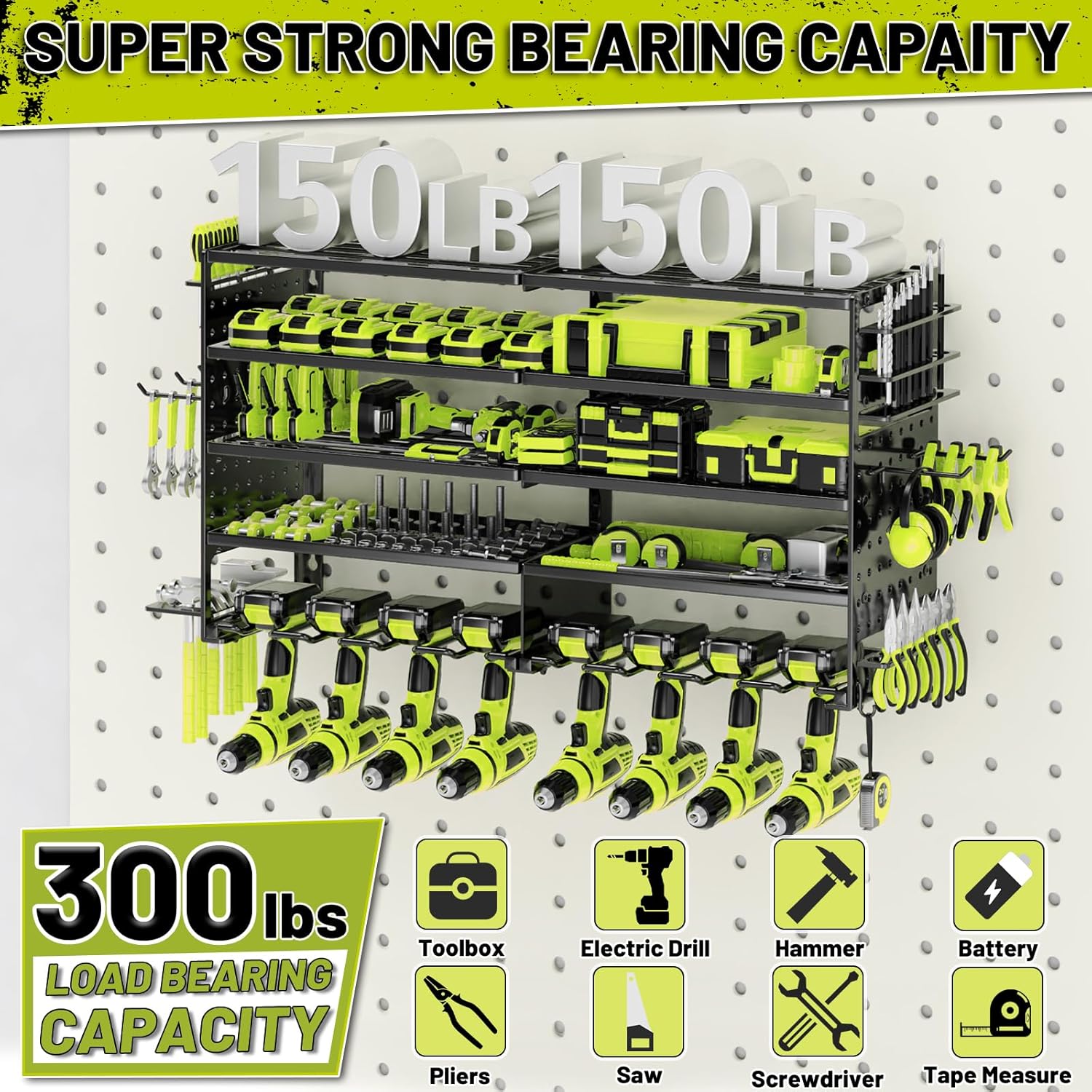 - 【Durable & Heavy-Duty】 Constructed from heavy-duty, compact steel metal, this power tool organizer wall mount features thickened steel wires and beams for exceptional strength and durability, resisting bending and breakage. This garage tool organizer boasts a load capacity of up to 300 lbs. All surfaces are meticulously smoothed and coated with a sleek black anti-rust finish, enhancing the tool rack's lifespan while protecting hands from scratches.