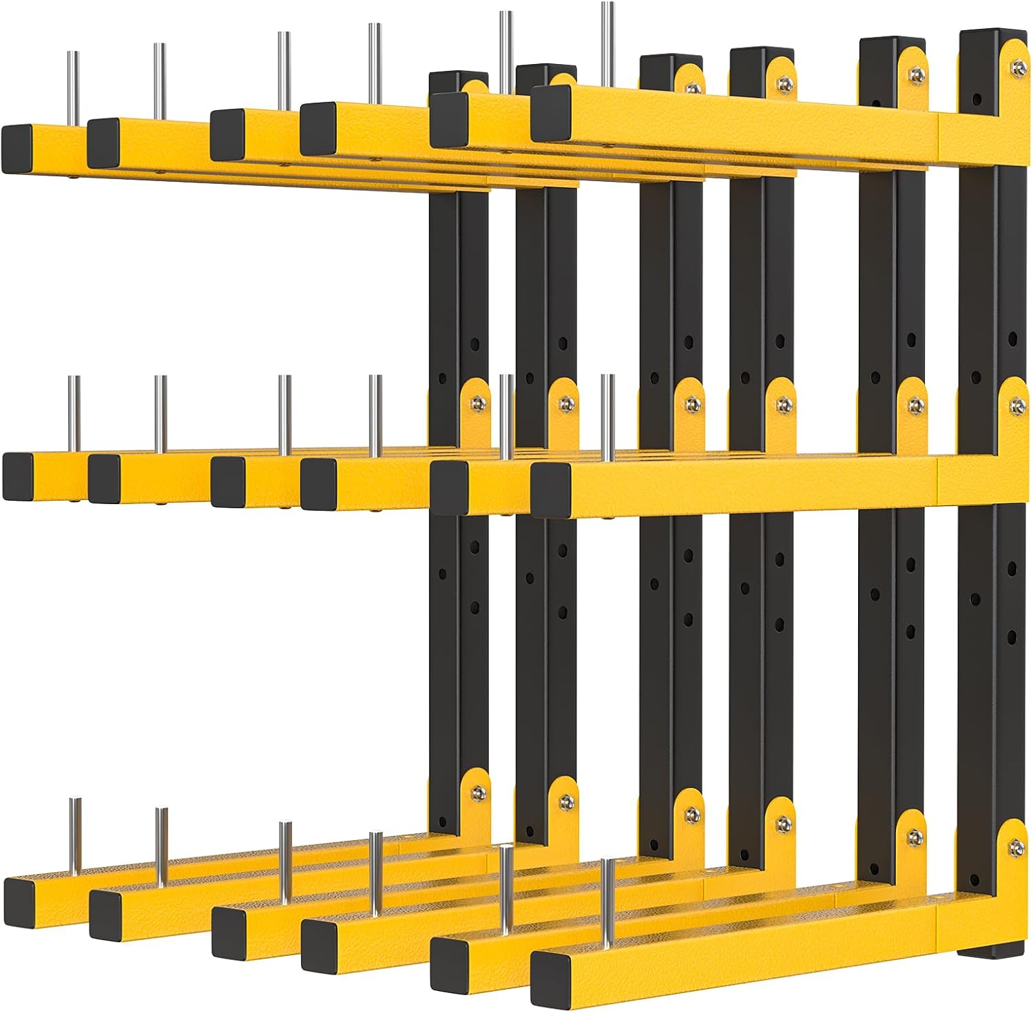 - LUMBER STORAGE RACK WALL MOUNT: Wood storage rack is suitable for various walls, such as concrete wall, wood panel wall, red brick wall, etc. The yellow arm is 16 inches long, and the middle bracket moves up and down 4 inches according to the storage size. The Lumber rack storage space size is (7 inches) and (11 inches) The recommended installation distance between the rails is 3.8 to 6 feet, which can be adjusted according to your needs