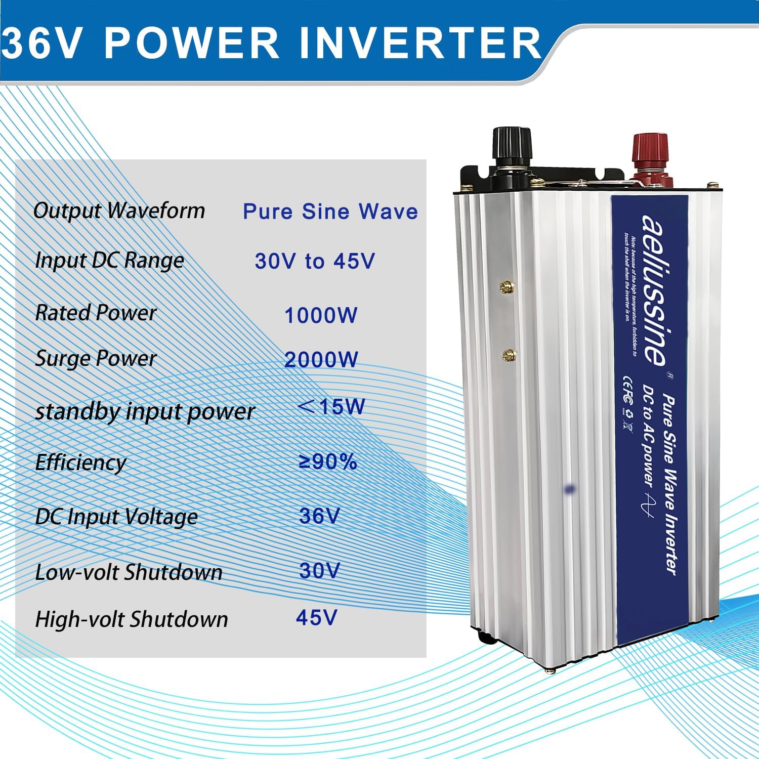 1000W Pure Sine Wave Inverter-36V DC to 110V 120V AC Power Converter with 2 AC Outlets, 36 Volt Power Inverter for Home, Emergency Power