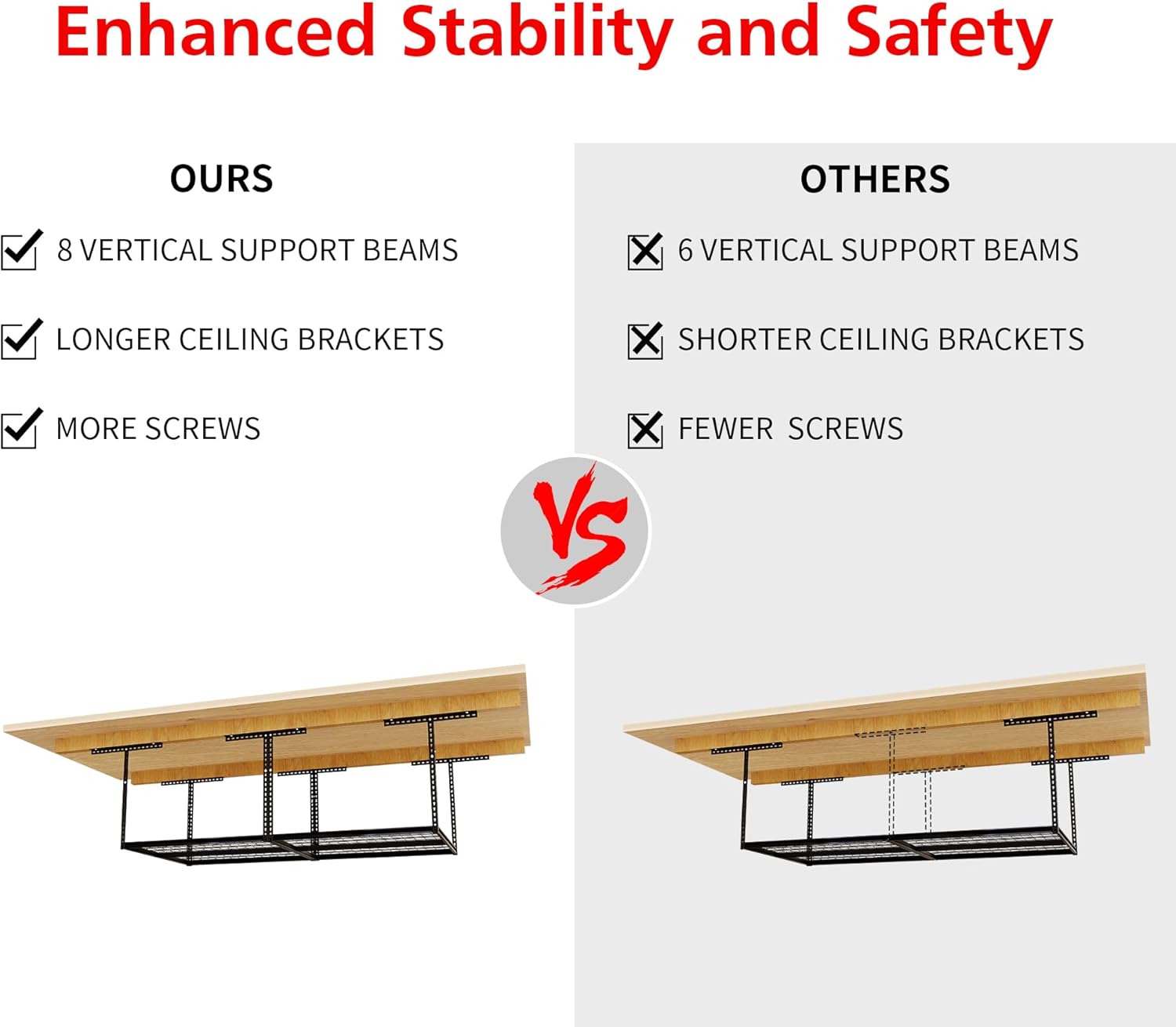 - 【Adjustable Height Rack】 Drop range of 26"–48" fits most garage ceilings and offers up to 122 cubic feet of overhead space—ideal for bins, tires, tools, and seasonal gear. Frees up valuable floor area for vehicles and workstations