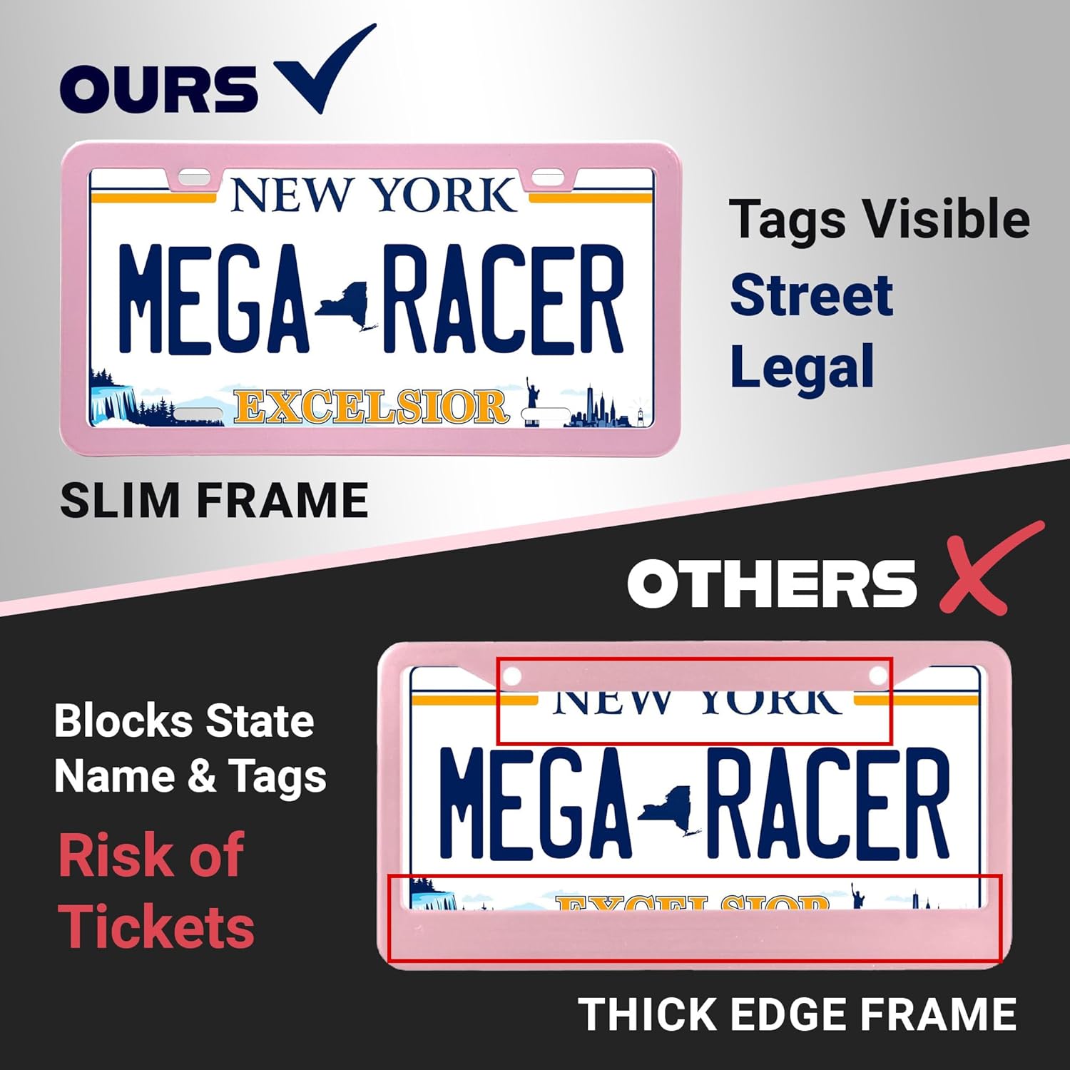 - FEATURES: Mega Racer's Pink License Plate Frame Set contains a 2 piece slim license plate frame for women and is mighty strong. This cool sleek style ensures that the state name and registration tag are not blocked.