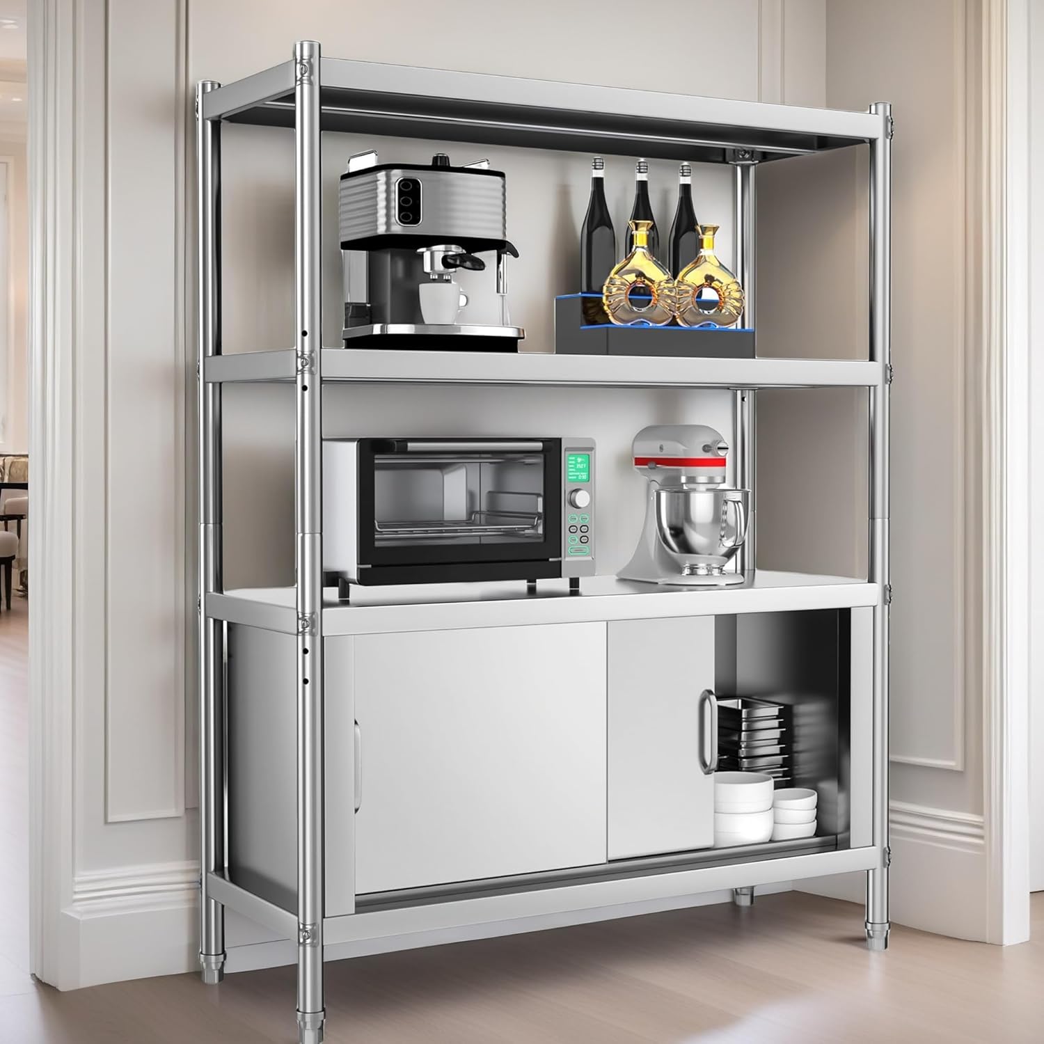 - Adjustable height shelves: YITAHOME stainless steel shelves can be adjusted in the middle layer, allowing you to customize the height to better suit your needs and provide greater flexibility for organizing your items; The distance between the middle holes is 5cm; The innovative storage cabinet design meets a wider array of storage requirements