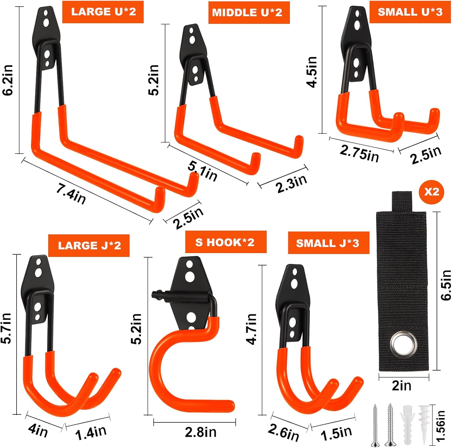 - ZexHok Wall Hook Assortment Set: 16 pack storage hooks organizer include with 6 sizes: 3pcs small J hooks, 3pcs small U hooks, 2pcs large J hooks, 2pcs middle U hooks, 2pcs large U hooks, 2pcs S hooks and 2pcs straps for hanging tools of different sizes and weight.