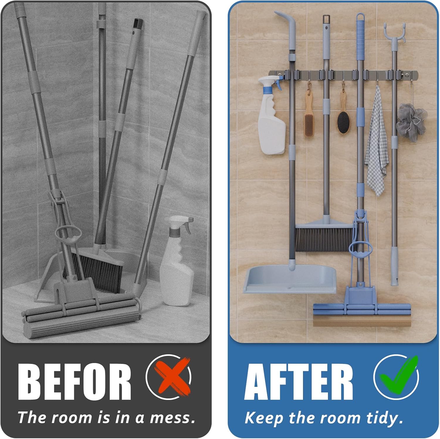 - 【Versatile & Cost-Effective】Compatible with most brands of brooms and mops, this rack eliminates the need for multiple holders by organizing all your cleaning tools in one place. It’s a budget-friendly upgrade for clutter-free living.