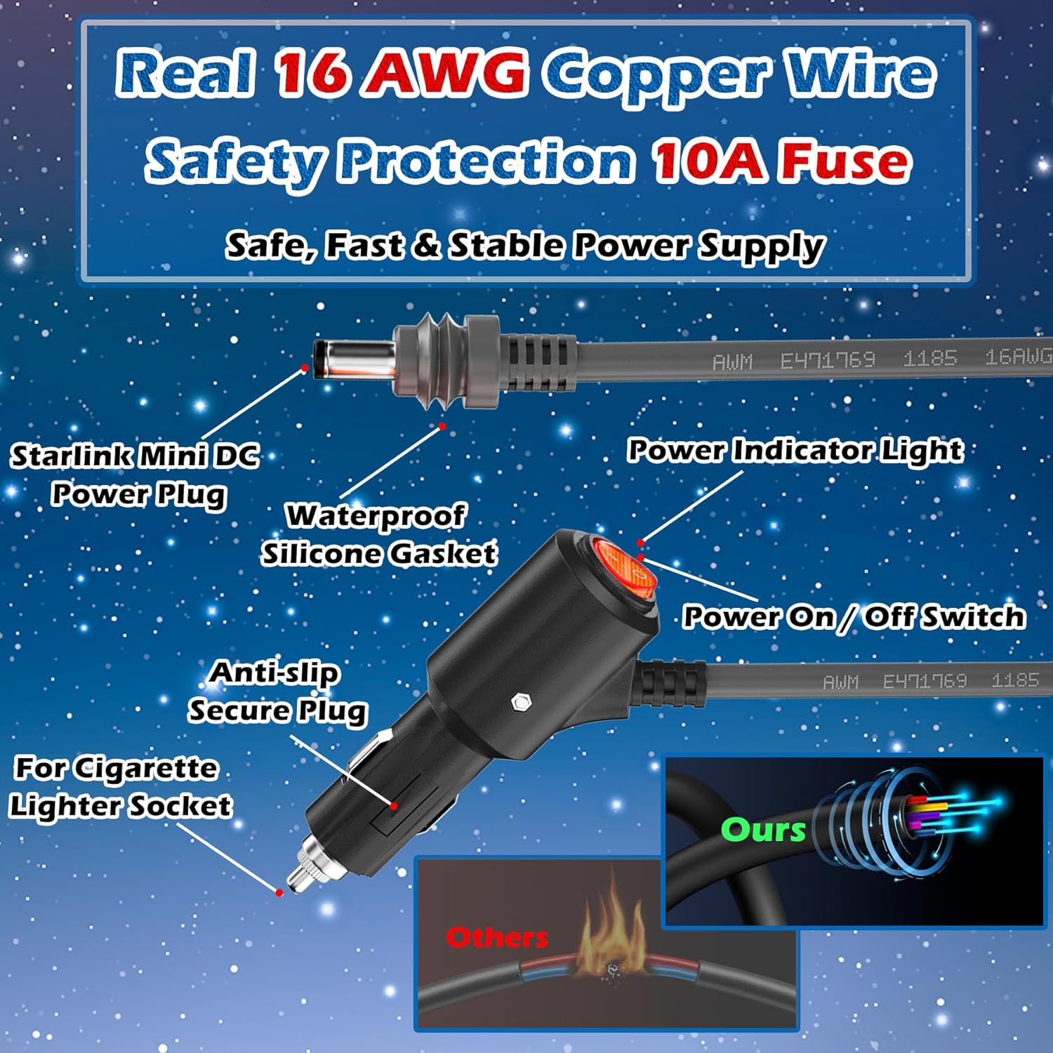 - EFFICIENCY AND RELIABILITY: Made of heavy duty 16AWG copper wire, the starlink mini 12v adapter ensures stable and reliable power transmission. And the 10A fuse prevents your Starlink Mini from damage or performance issues caused by power fluctuations. The waterproof design guarantees flawless operation even in challenging weather conditions.