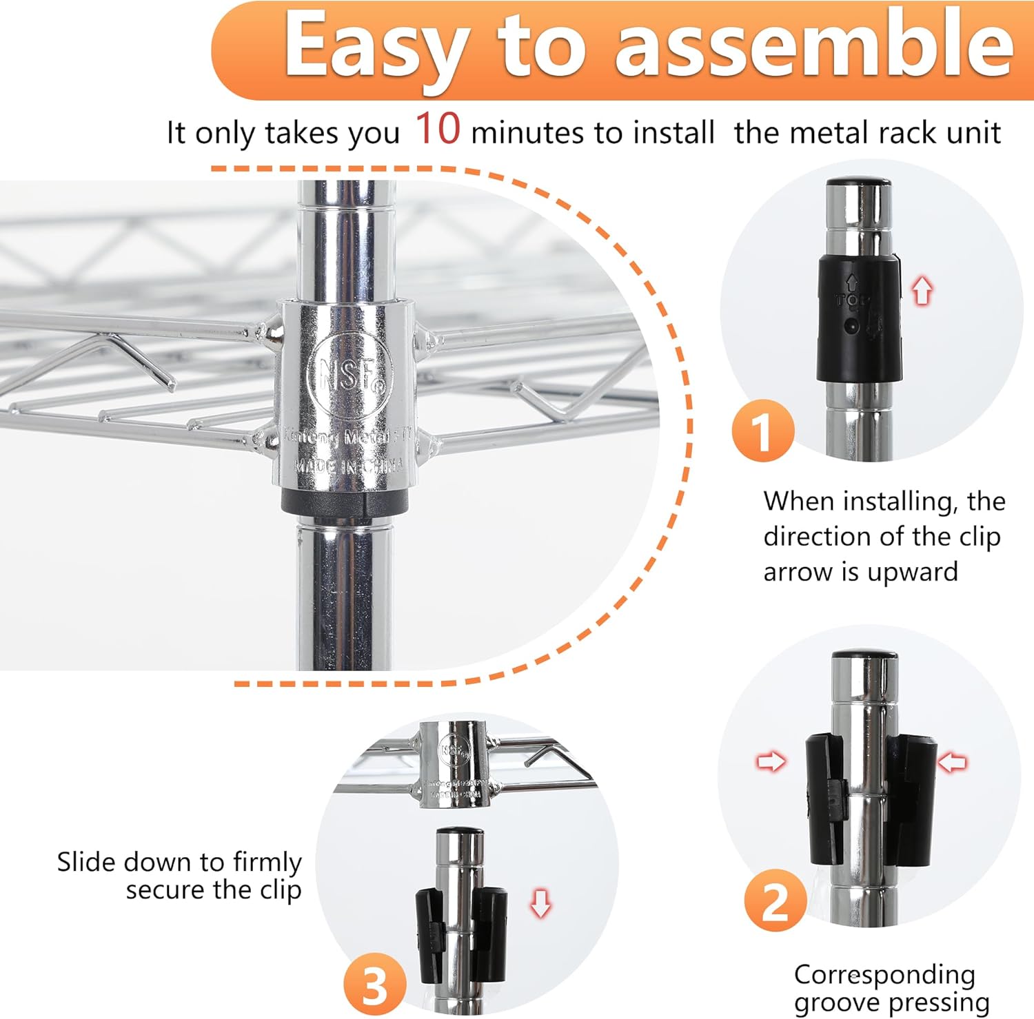 - Easy and Quick Assembly: With simple instructions and a user-friendly design, this wire shelving can be assembled quickly without the need for complicated tools. Spend less time setting up and more time organizing your space. Enjoy a hassle-free installation process with a sturdy and functional shelf in no time.