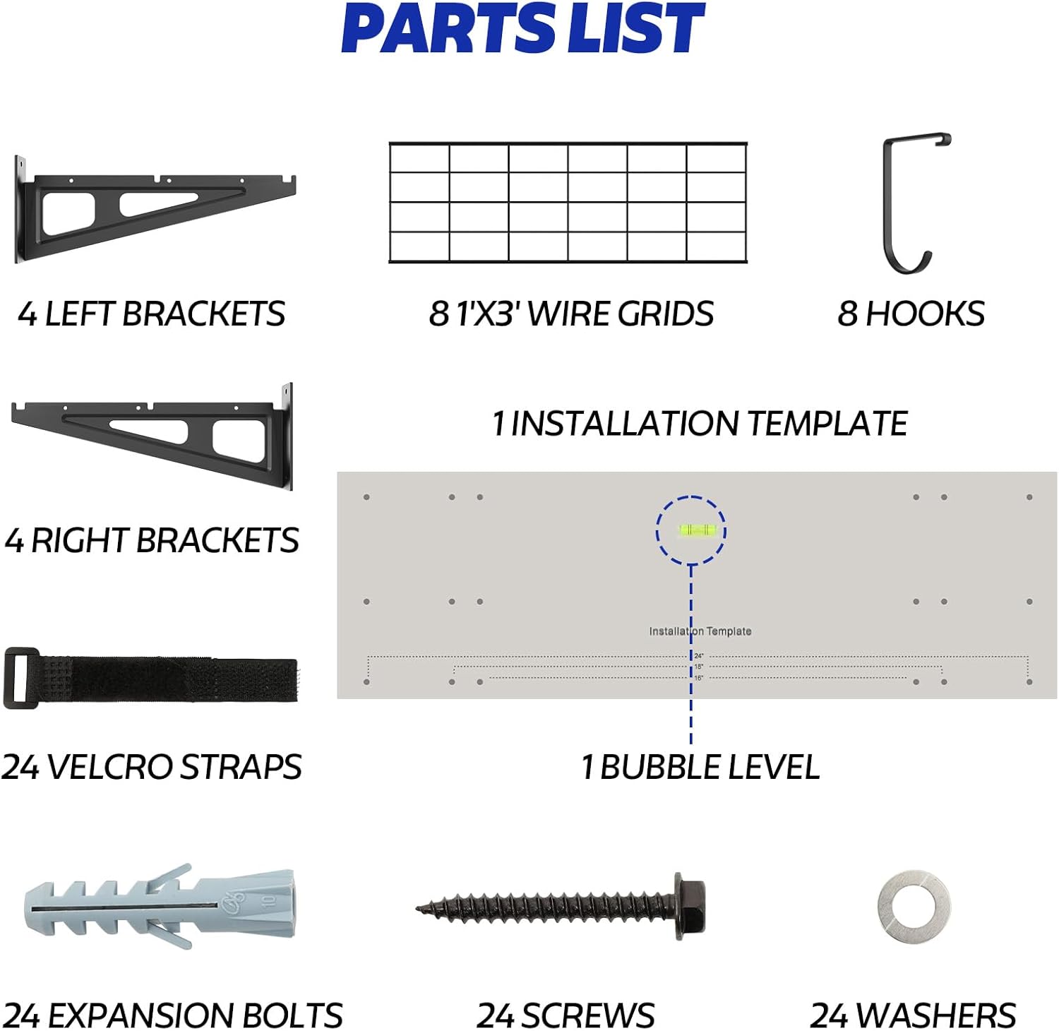 - Multiple Installation Options: This garage wall storage rack consists of 8 1x3ft grid panels and also comes with 8 hooks, so you can choose different installation methods, such as parallel installation, vertical installation and separation installation.