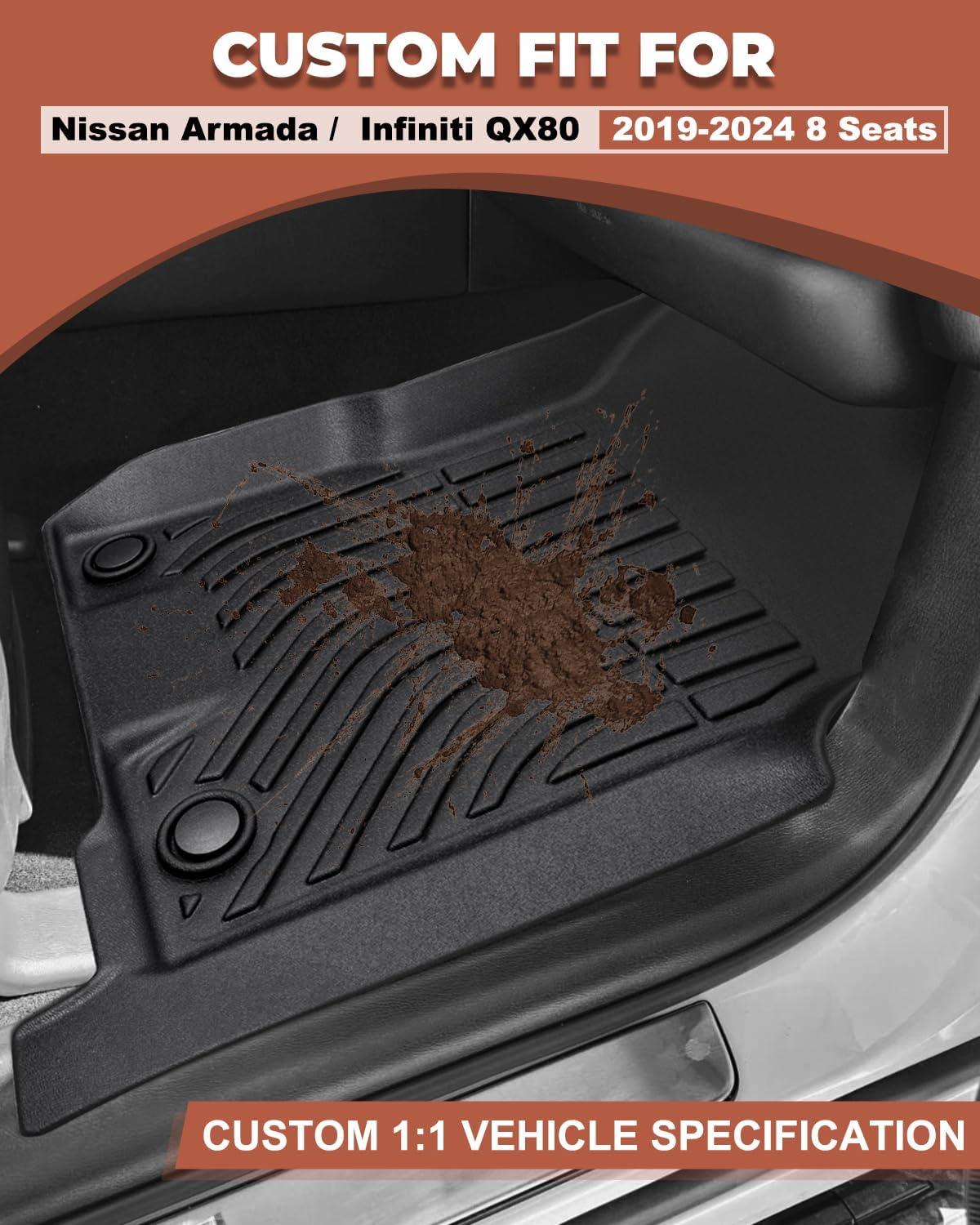 - Perfect Custom Fit: Specifically designed for 2019-2024 Nissan Armada and Infiniti QX80 models, these floor mats are crafted using advanced 3D laser scanning technology for a precise fit. Includes 1 driver-side mat, 1 passenger-side mat, and 1 second-row mat, ensuring complete coverage and protection for your vehicle’s front and second-row footwell.