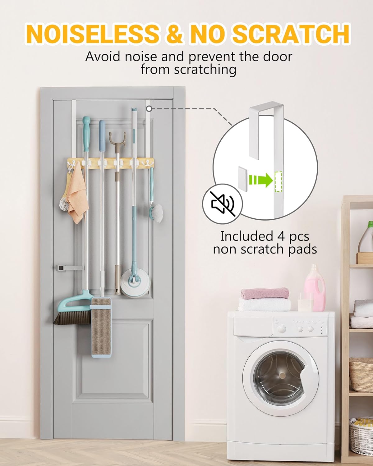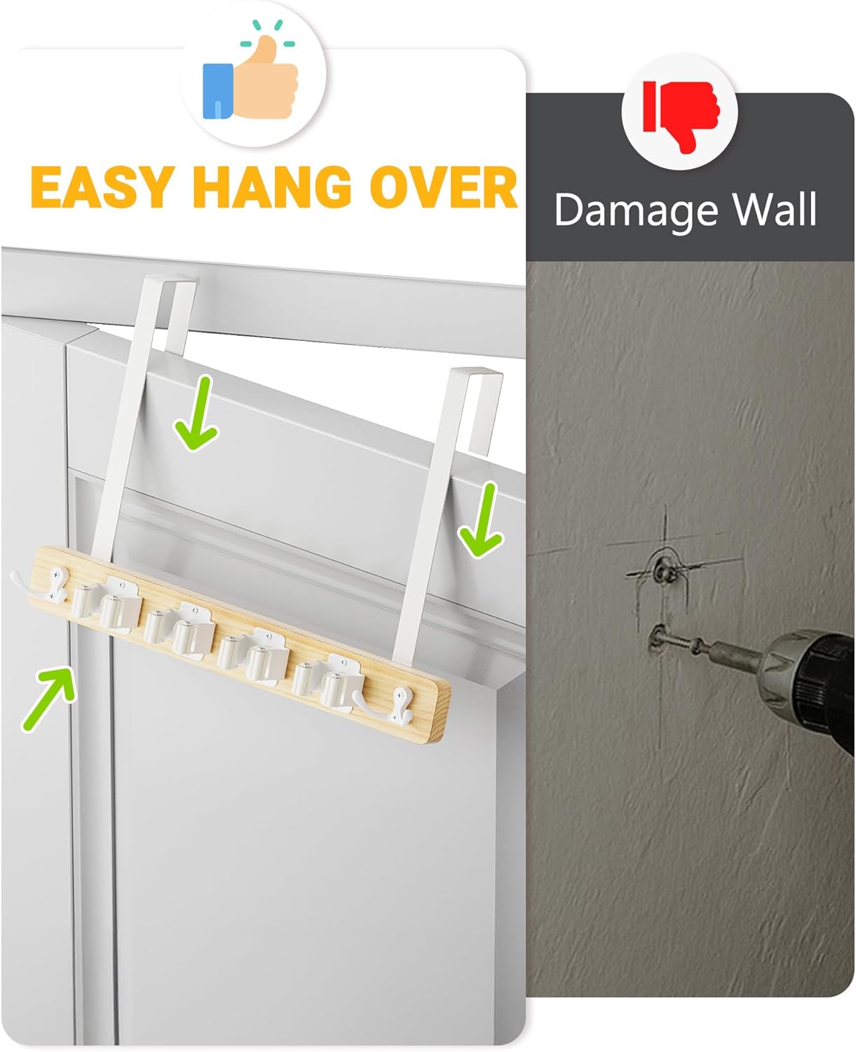 - No Drill, Easy Installation: Installing broom holder door mount is simple and drill-free. Broom holder includes 4 non-scratch pads to protect door from scratches and eliminate "rat-rat" noises, ensuring a peaceful environment. Hooks are 1.9" wide and 0.07" thick, as thin as a penny, fitting most doors. Ideal for renters or anyone who wants to avoid damaging walls, you simply hang it over the door with the included hooks. This method efficiently organizes space without any damage (Patent registration has been approved)