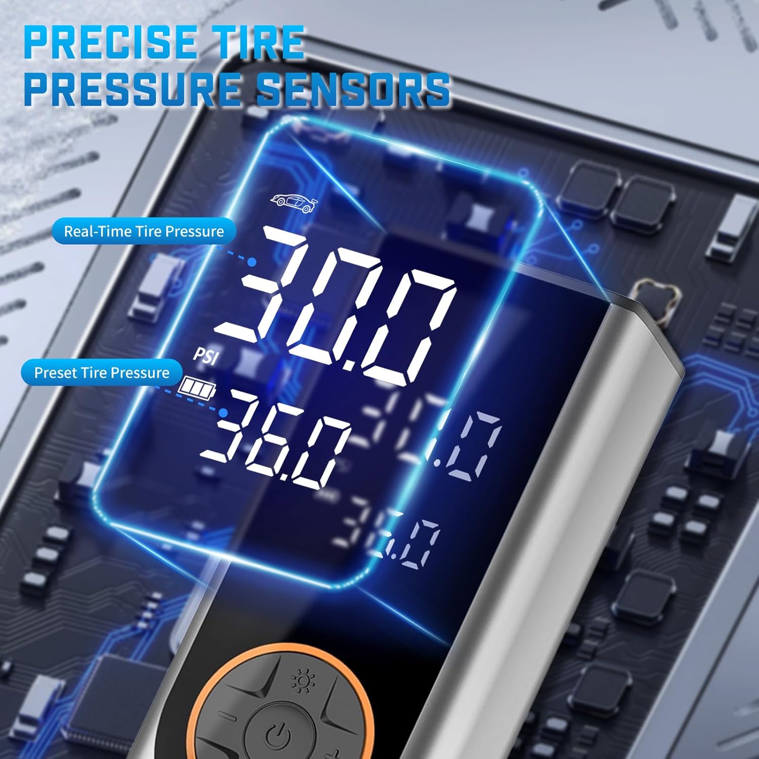 - π Long Battery & Built-in LED Light: This car tire air pump portable has a 6000mAh battery and a bright LED with three modes, ideal for nighttime use, tire changes, and emergencies. It also functions as a flashlight when needed.
