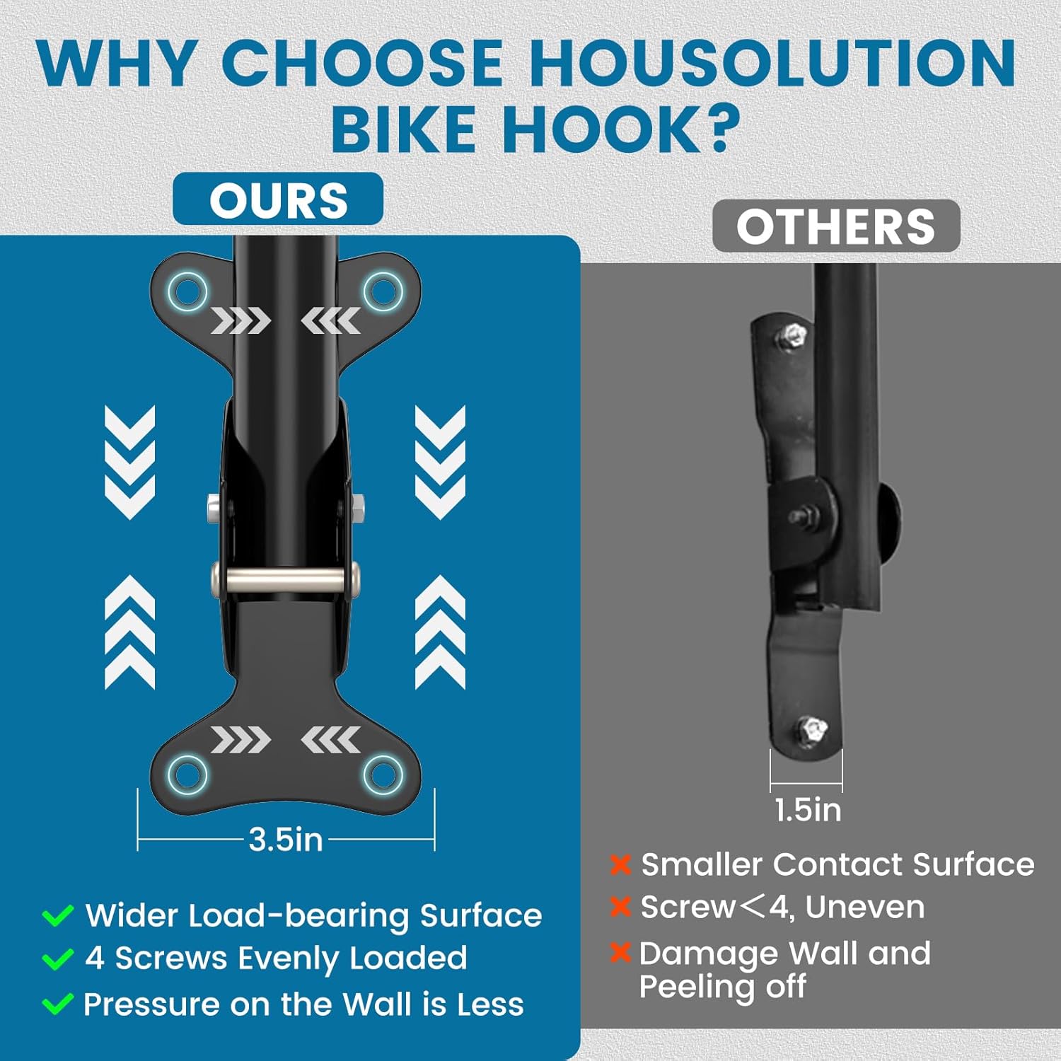 - Secure Storage, Save Space: Made of high-grade sturdy steel, the bicycle wall hanger keeps your bicycle safe. With the Max 90Β° adjustable angle, the rack can accommodate various frame shapes, keeping the bicycle level and fixed. Housolution bicycle wall mount is an ideal space saving option for apartments, houses, garages, and sheds by horizontally hanging the bicycle on the wall.