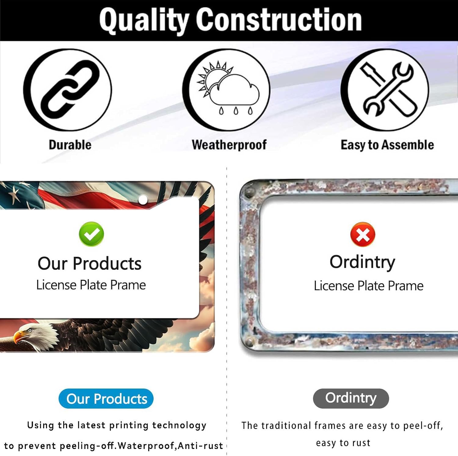 - DURABLE CONSTRUCTION: Made from premium quality metal with weather-resistant coating.Rain or Shine, Stay Secure – Our Rust-Proof Eagle License Plate Frame Won’t Budge at Any Speed!