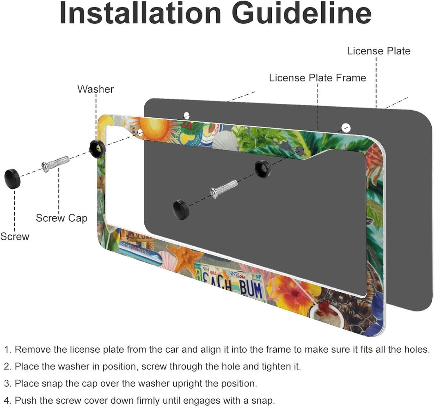 - ▶Quick Installation Design: Simply insert your license plate into the license plate holder and align the plate with the 2 holes on the frame for easy installation. The 2 Pieces aluminum summer beach license plate frames accessories include 4 screw caps, 4 screws, 4 washers.